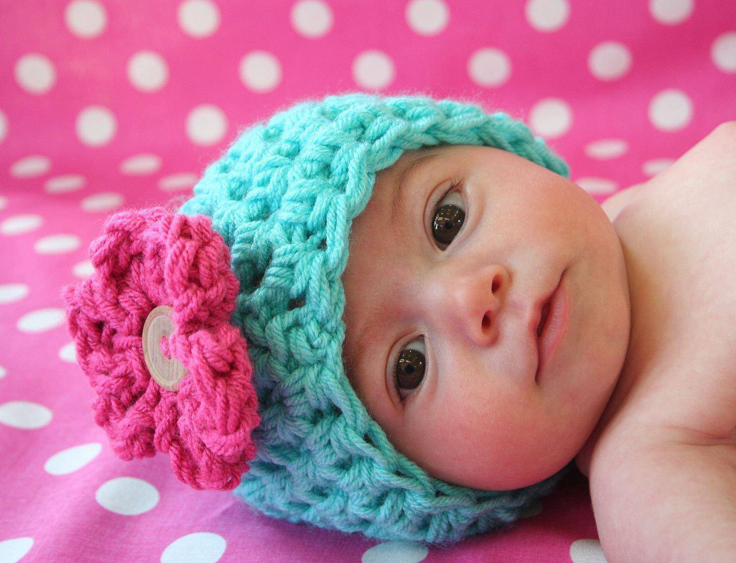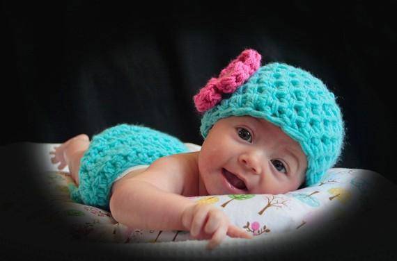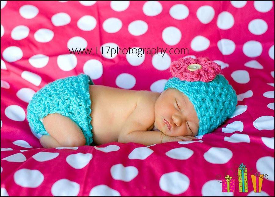 This gorgeous aqua blue and pink newborn diaper cover and flower hat set is made from a super soft acrylic yarn. The hat has a cute flower button embellishment and the diaper cover unbuttons for easy use.