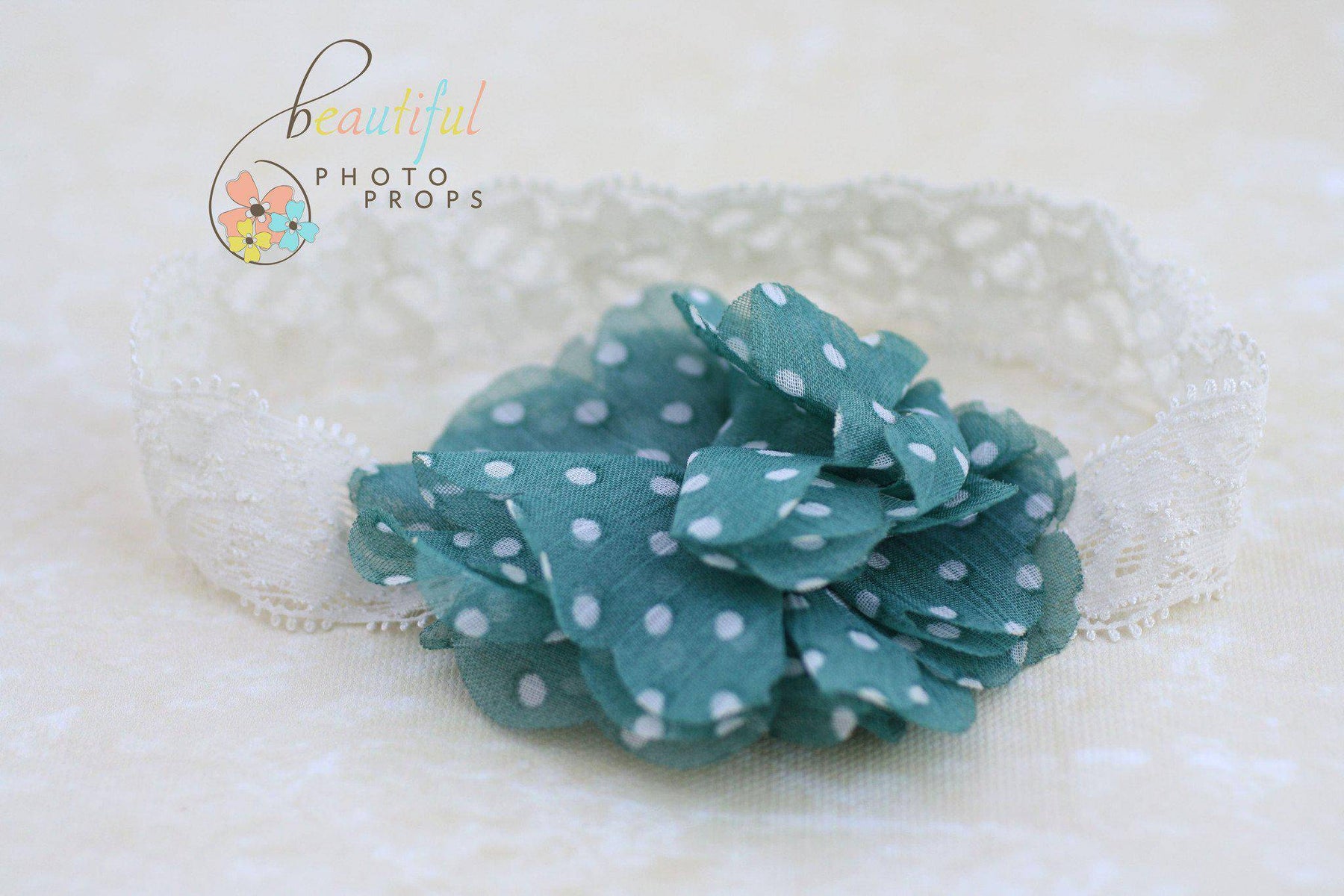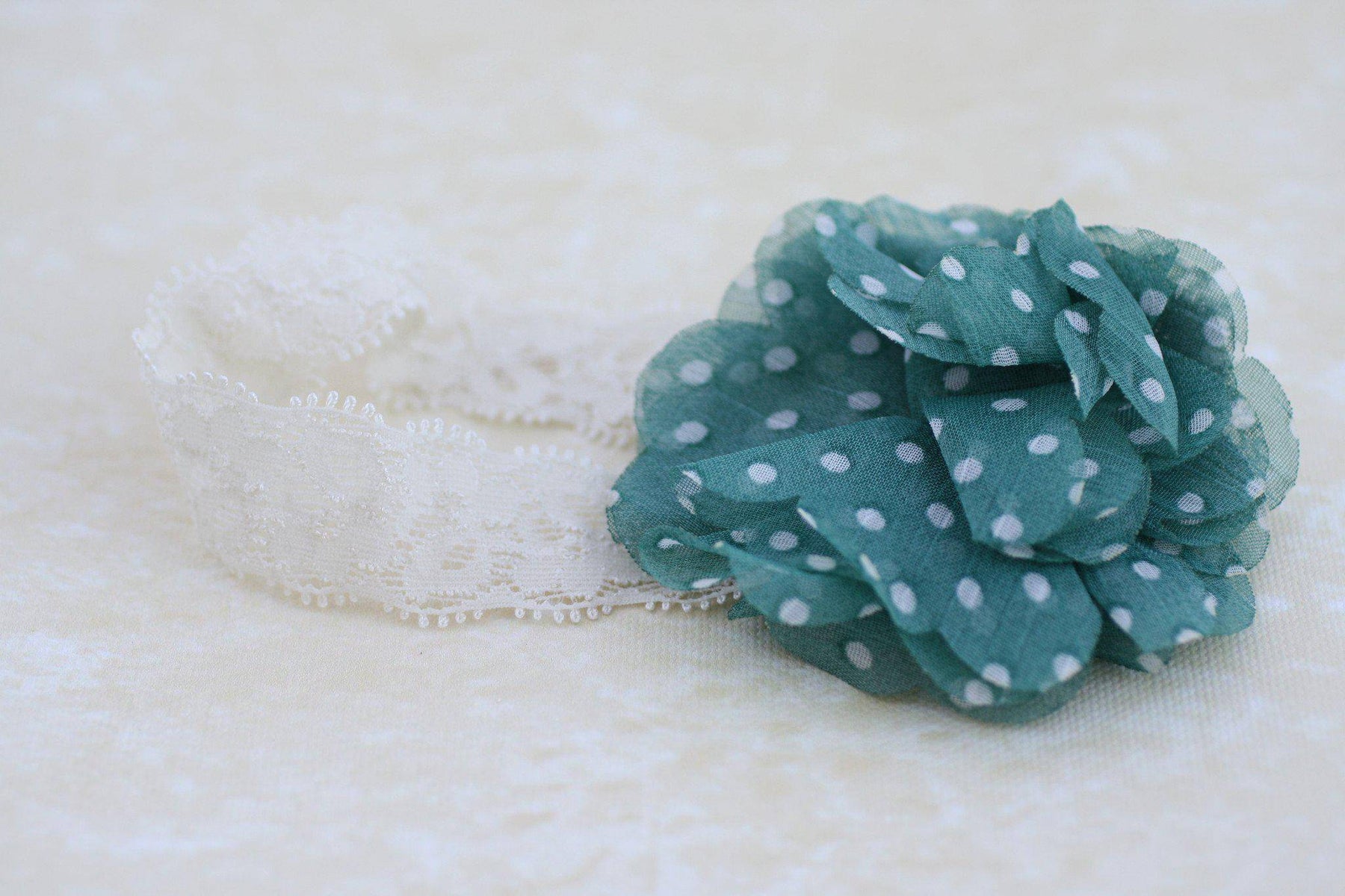 A photographer's dream! This sweet polka dot flower headband is so adorable and soft, it reminds me of being a kid again! The lace elastic band paired with layers of aqua blue petals with white polka dots is the perfect piece to wear at any age, from newborn to adult!