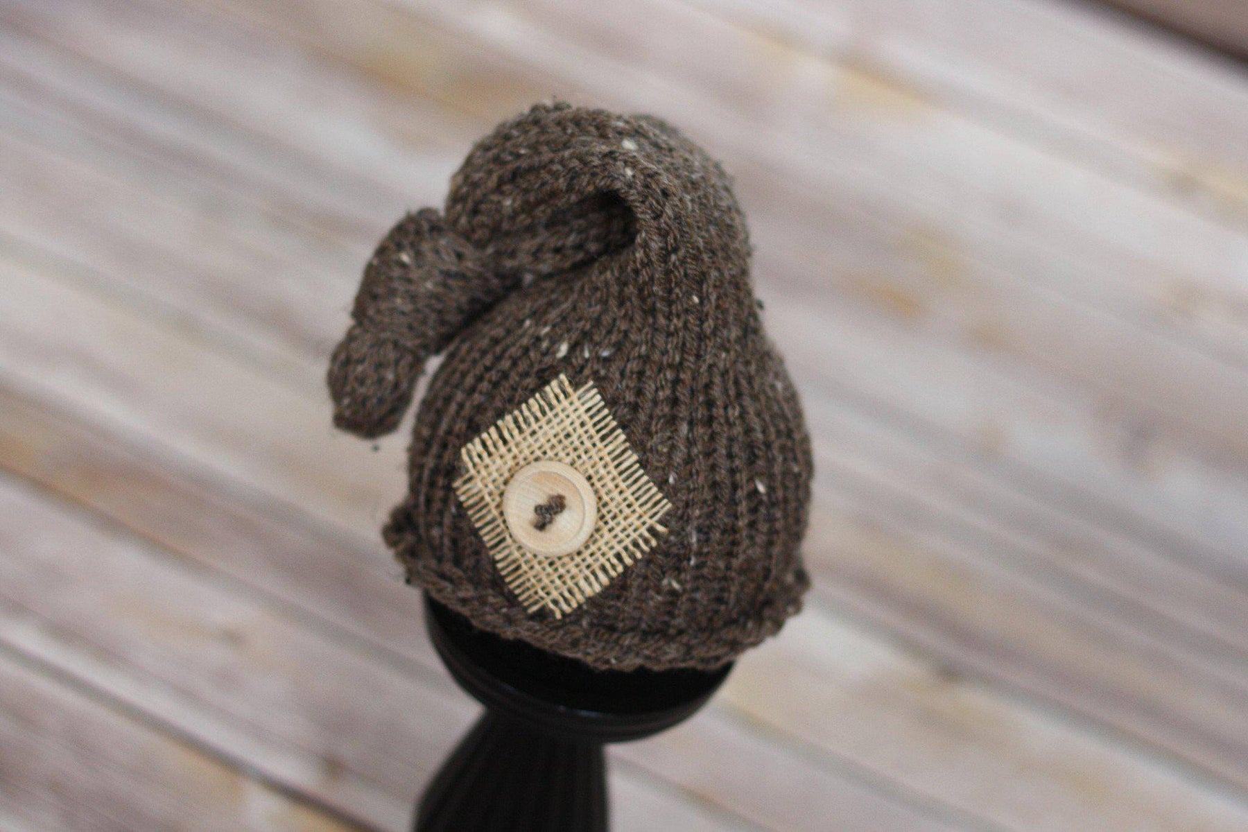 This gorgeous barley brown newborn pixie slouch hat is made from a super soft acrylic yarn and includes burlap and button embellishments. It is the perfect fit to keep your precious little ones' head nice and warm.