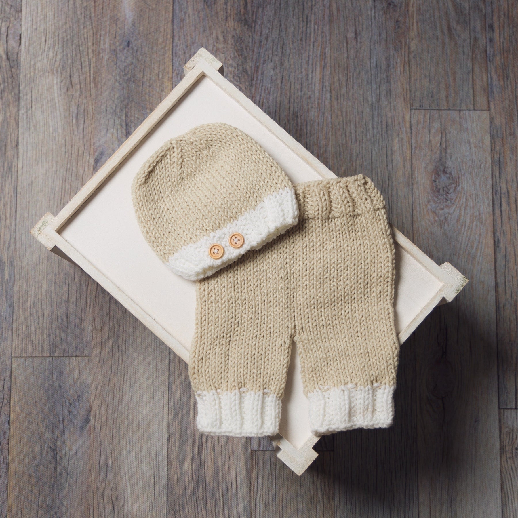 Beige and Cream Knit Newborn Button Hat and Pants Set