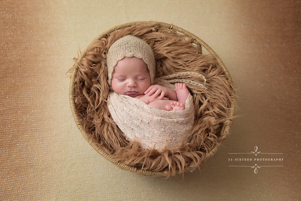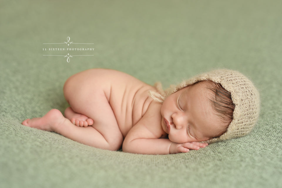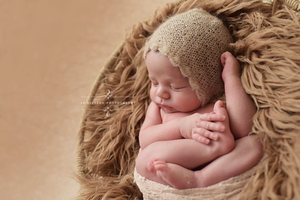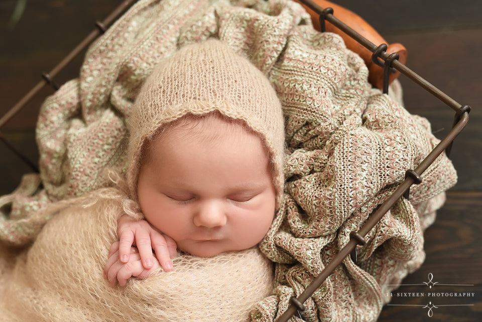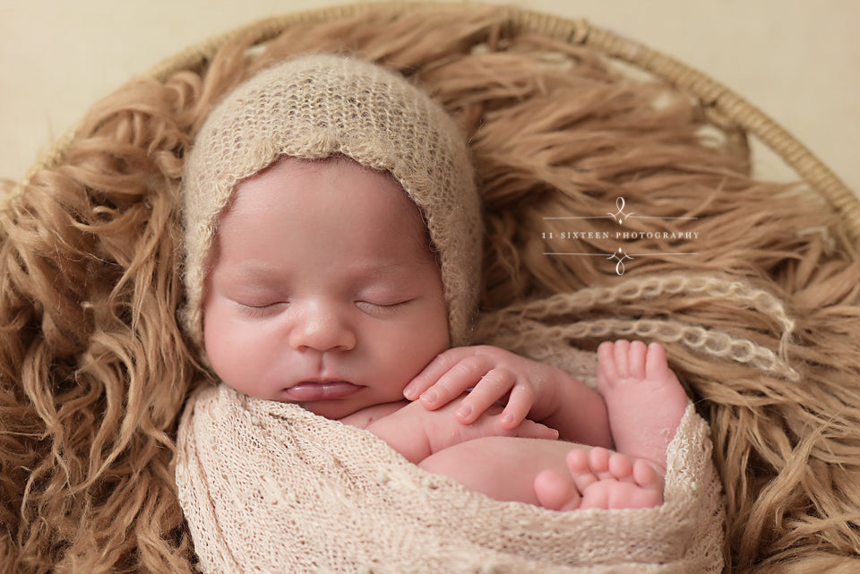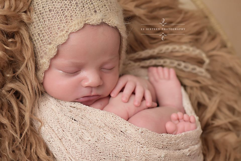 This ADORABLE newborn scallop bonnet hat is made from a super soft mohair yarn. It is the perfect hat for your newborn baby photography shoot! It has plenty of stretch. Your sweet little one will feel so comfy wearing this super soft hat!