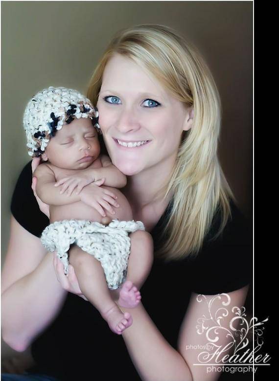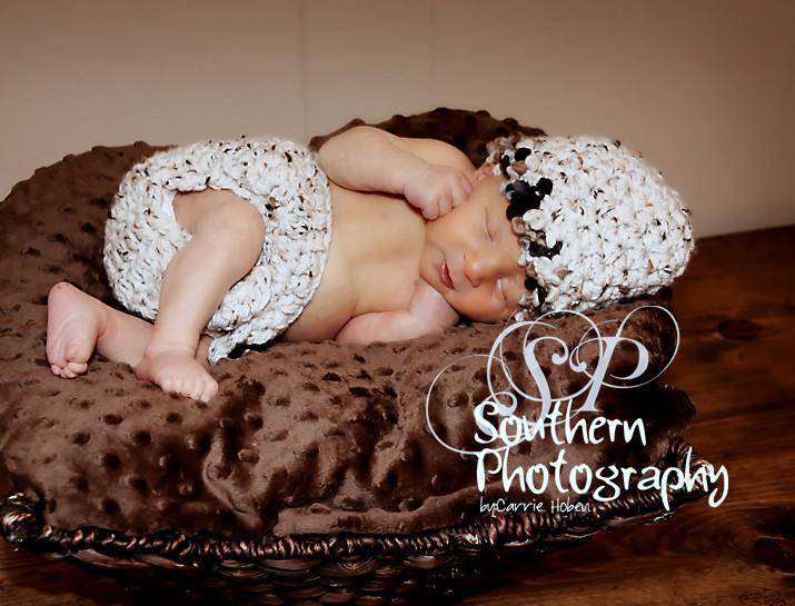 The beanie is crocheted in the round and measures 12-13 inches with plenty of stretch. Your sweet little one will feel so warm and comfy wearing this thick hat and this makes the perfect beanie for professional photo shoots. The matching diaper cover keeps your little one's diaper nice and hidden :)
