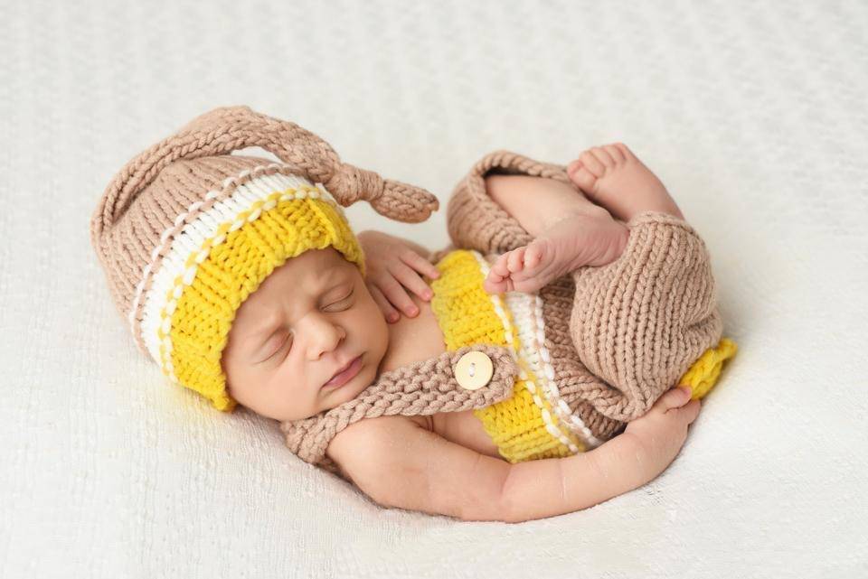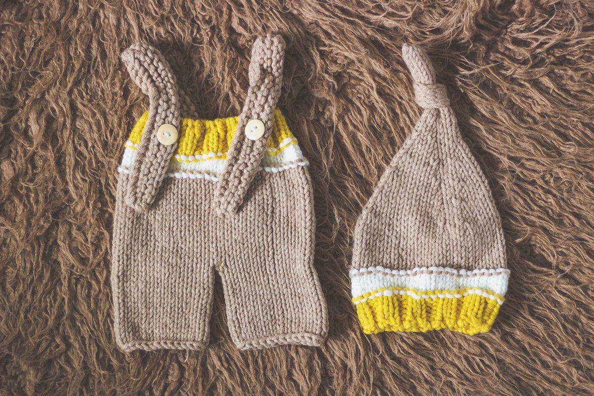 This adorable beige, yellow and white knit newborn knot hat and overall pants set is made from a super soft yarn and is just so sweet! Your little one will feel so warm and comfy wearing this super soft set, they are just perfect for professional photo shoots or everyday wear.