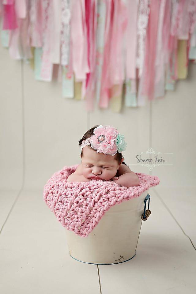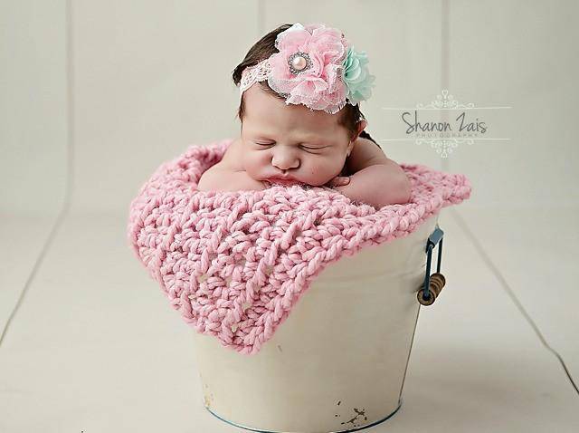 Chunky and fun! This gorgeous blossom pink newborn baby blanket is made from a super cozy acrylic wool blend yarn that is nice and thick. The perfect size little blanket to throw in your bowls and baskets for that awesome pop of color and is great to add to your photo prop collection! It is 24 inches by 18 inches so it's THE perfect fit. The babies like to snuggle right down into it!