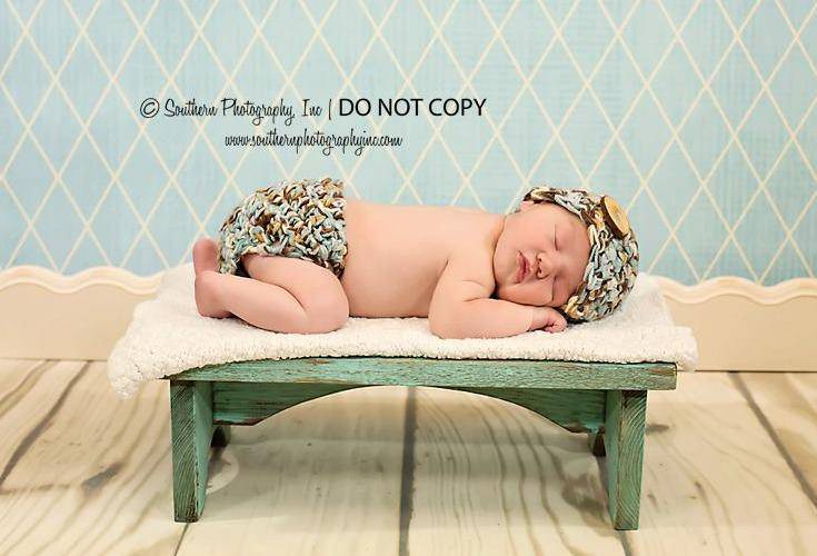 This gorgeous blue, brown and cream colored newborn photography diaper cover and button beanie hat set is made from a nice and soft acrylic yarn. Both pieces have real wood tree branch button embellishments and the diaper cover unbuttons for easy use.