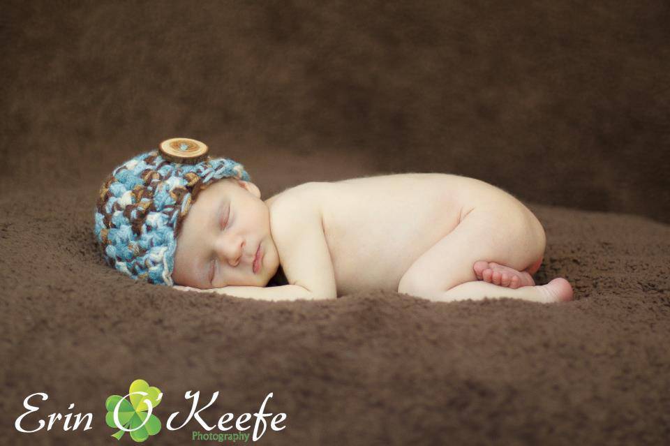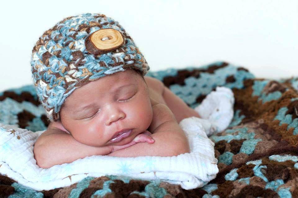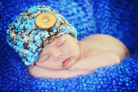 This gorgeous newborn photography beanie hat prop in shades of blue brown and beige is made from a super soft acrylic yarn with a real wood branch button embellishment. It is the perfect fit to keep your little ones' noggin' nice and warm.