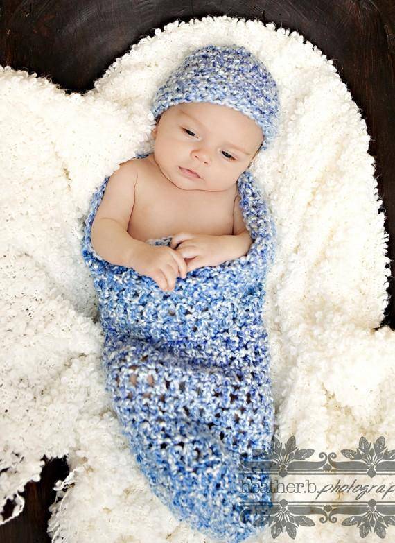 This gorgeous blue skies newborn photography cocoon and beanie hat prop set is made from a super soft acrylic boucle yarn. I have crocheted the cocoon in a looser stitch so that babies little bits and pieces can poke through and the hat is the perfect fit to keep your little ones' noggin' nice and warm.