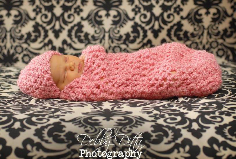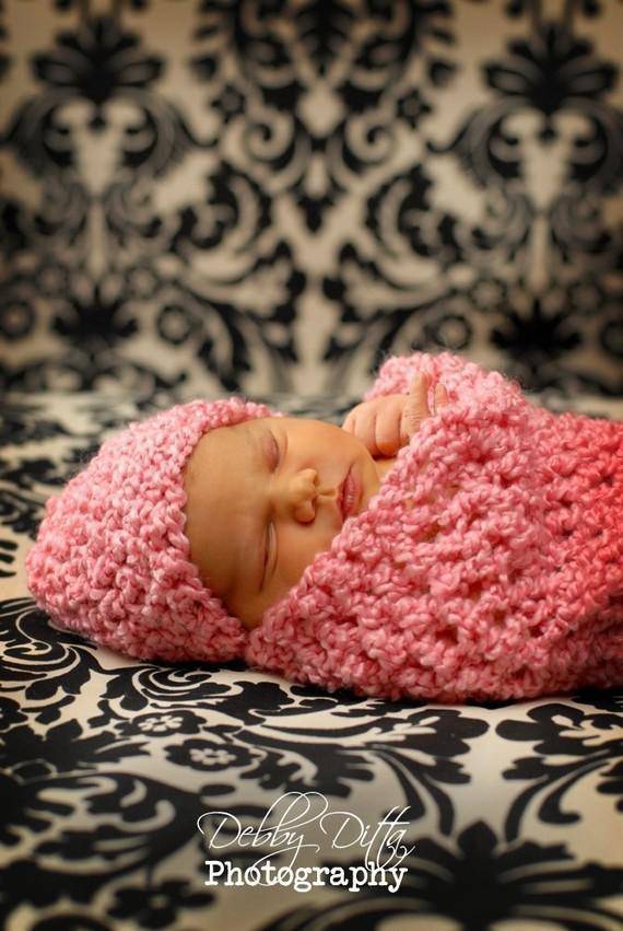This gorgeous newborn photography cocoon and beanie hat prop set in bubblegum pink is made from a super soft acrylic boucle yarn. I have crocheted the cocoon in a looser stitch so that babies little bits and pieces can poke through and the hat is the perfect fit to keep your little ones' noggin' nice and warm.