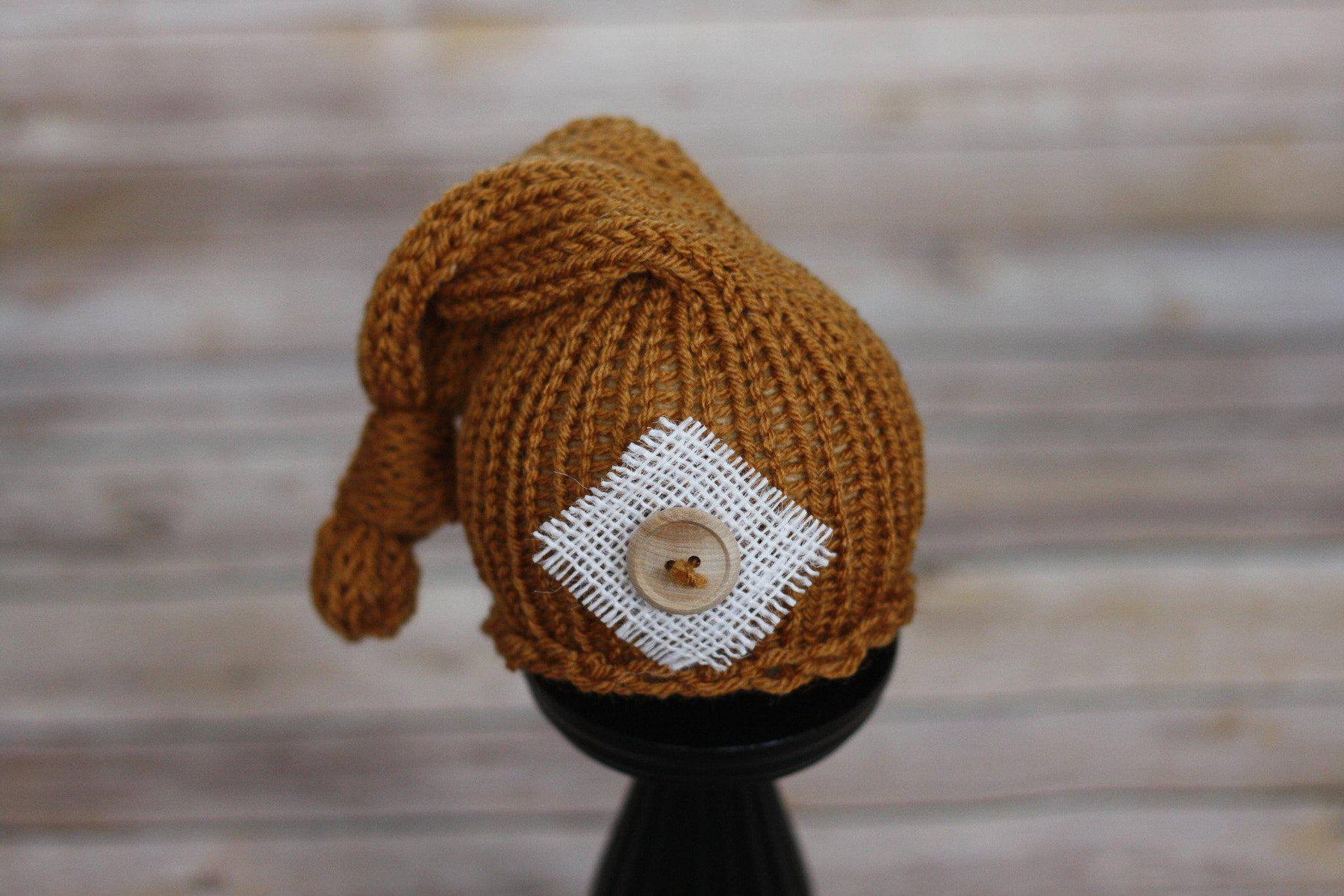 This gorgeous butternut brown newborn pixie slouch hat is made from a super soft acrylic yarn and includes burlap and button embellishments. Your sweet little one will feel so warm and comfy wearing this super soft hat and this makes the perfect beanie for professional photo shoots.