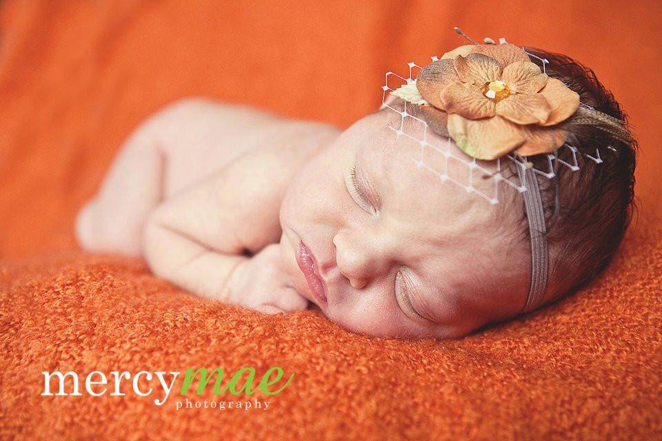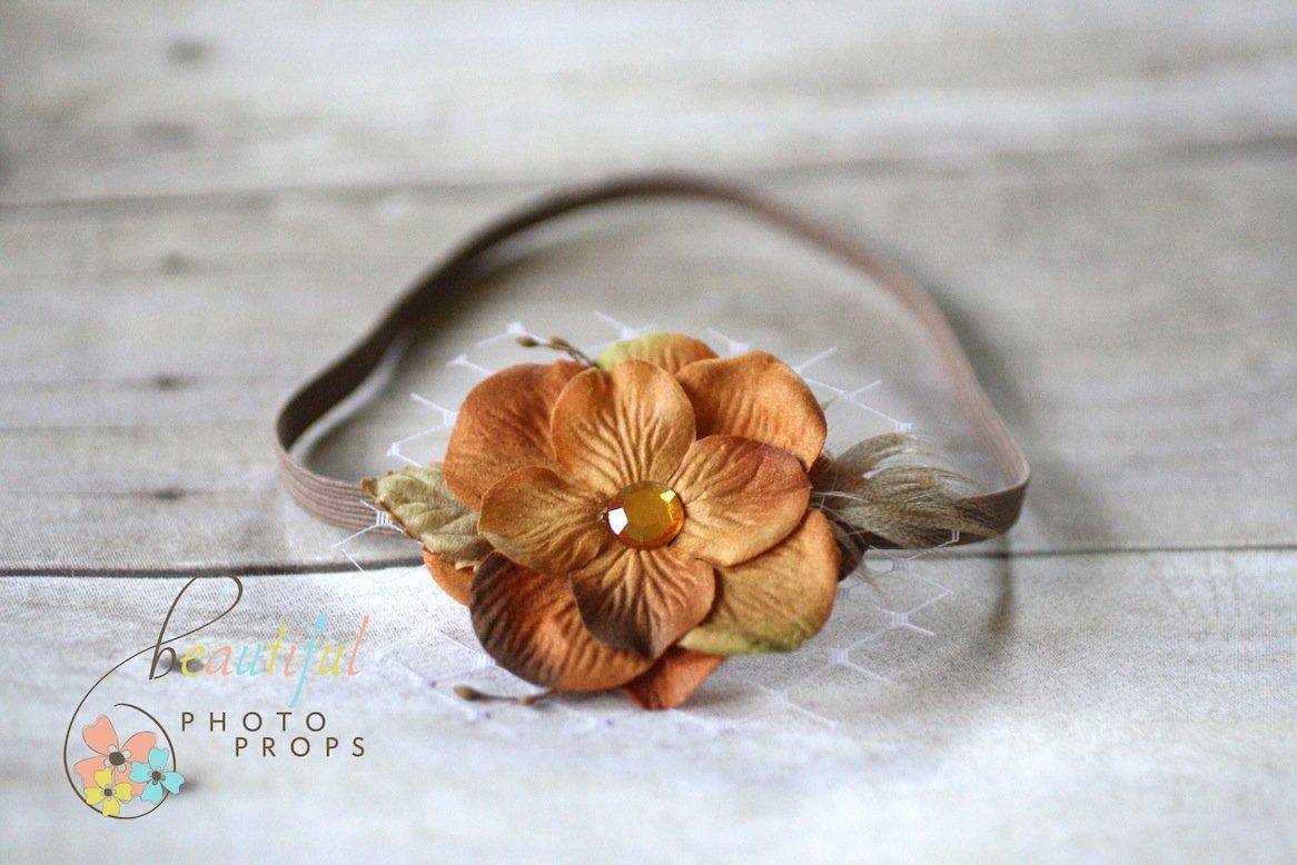 This sweet vintage inspired caramel brown flower feather headband with Russian veiling is so adorable! The matching elastic band paired with layers of petals and a rhinestone center is the perfect piece to wear at any age, from newborn to adult!