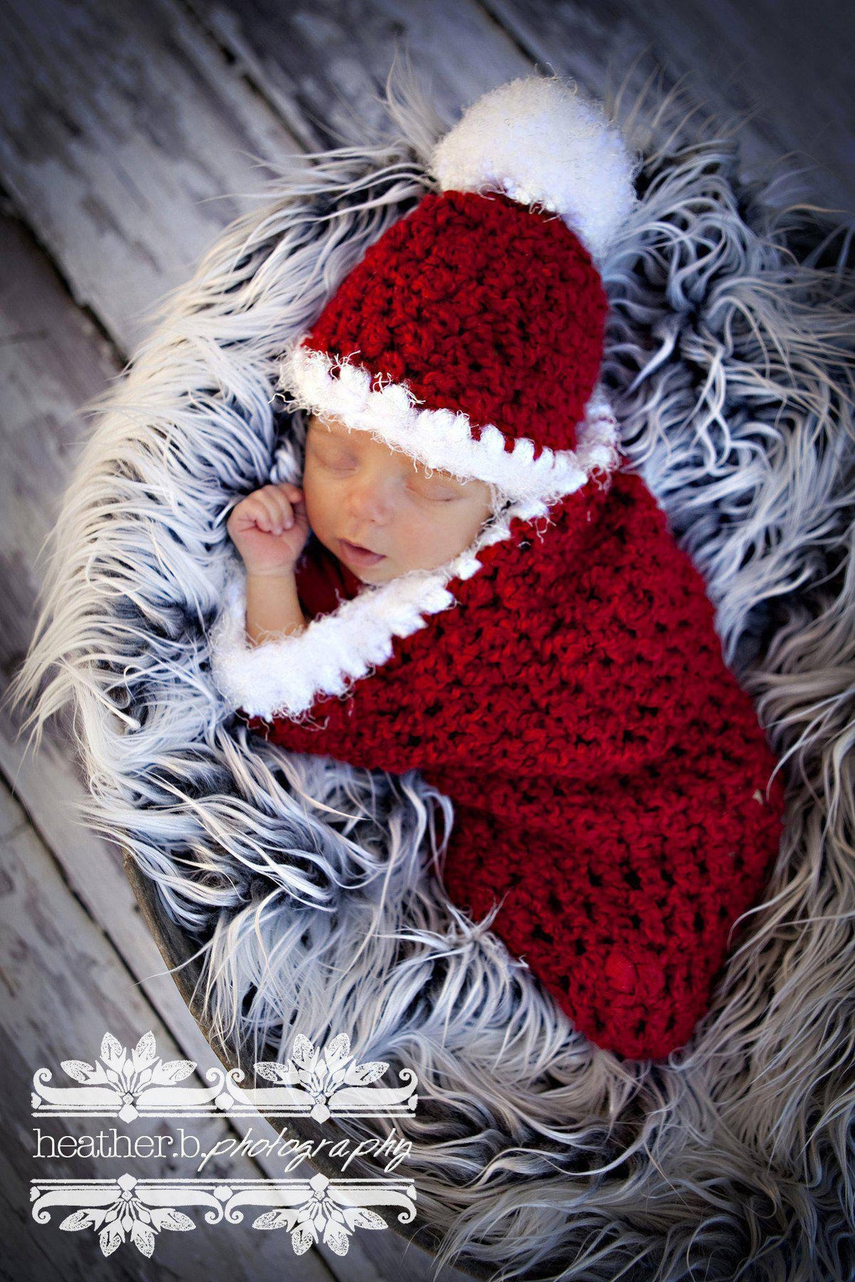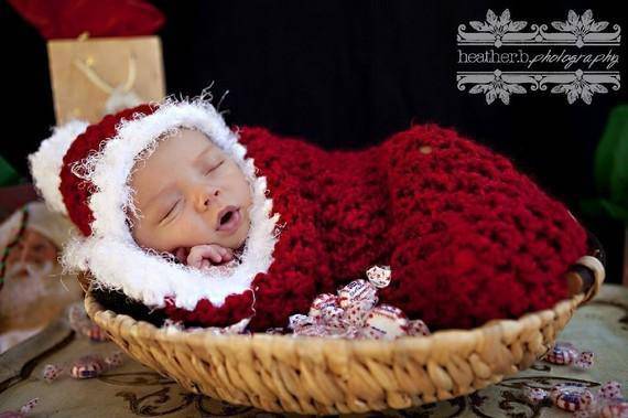 THIS IS FOR THE COCOON ONLY. This gorgeous red and white Santa Claus newborn photography cocoon prop is made from a super soft acrylic boucle yarn with fuzzy trim. I have crocheted it in a looser stitch so that babies little bits and pieces can poke through.