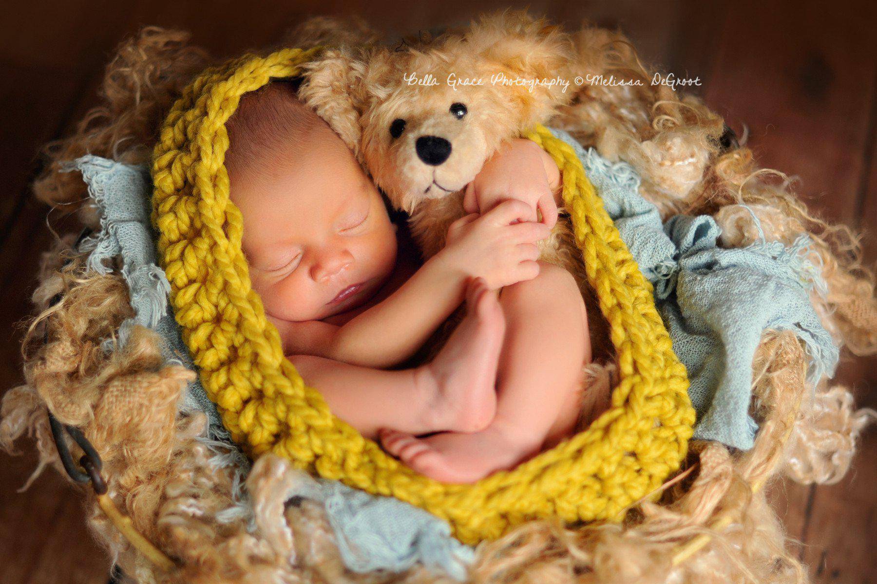 Super thick and oh so chunky! This gorgeous citron yellow newborn photography egg cocoon bowl prop is made from a super cozy acrylic wool blend yarn. The extra large stitches allow for your little babies toes and fingers to show through for the cutest pictures. It is crocheted in the round so that there are no seams.