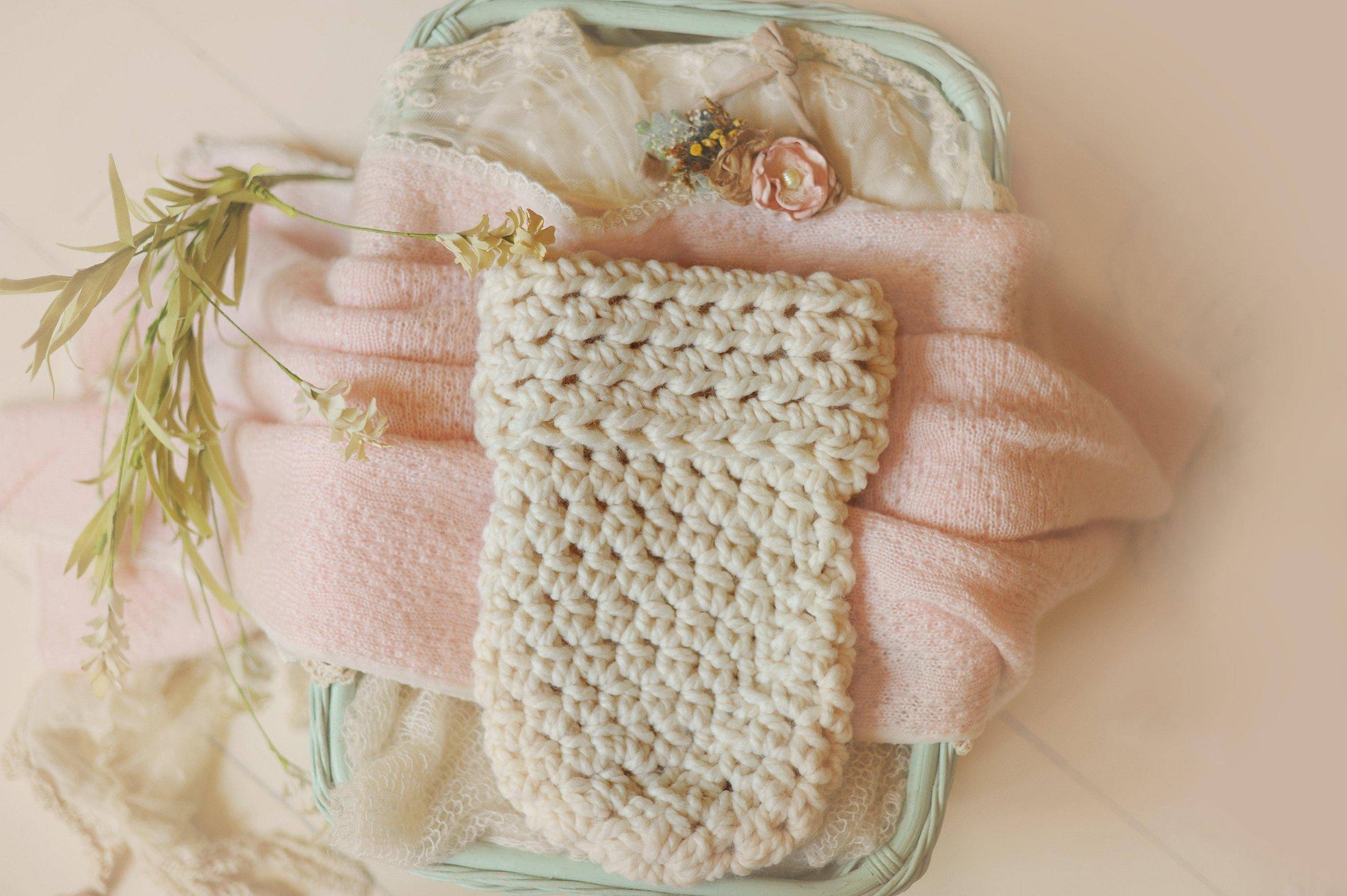 This lovely cream newborn photographic cocoon swaddle prop is made to look absolutely stunning. It will keep your infant warm and comfortable while also giving your newborn photography set a lovely rustic ambiance.