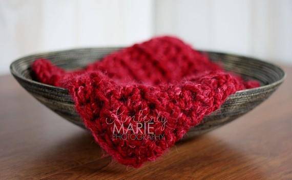 Super soft yet chunky! This gorgeous cranberry red newborn mini baby blanket is made from a super cozy acrylic wool blend yarn with a soft furry yarn added for just the right touch. This is the perfect little blanket to add to your photo prop collection! It is 24 inches by 18 inches so it's THE perfect fit. The babies like to snuggle right down into it!