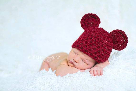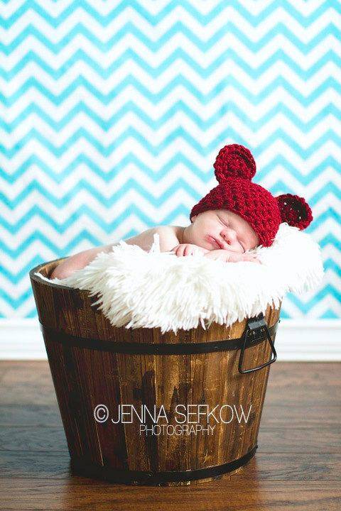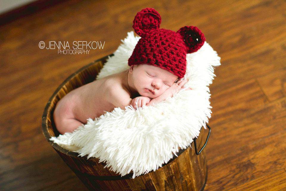 This cute little cranberry red crochet teddy bear hat is the perfect hat for those newborn photos!