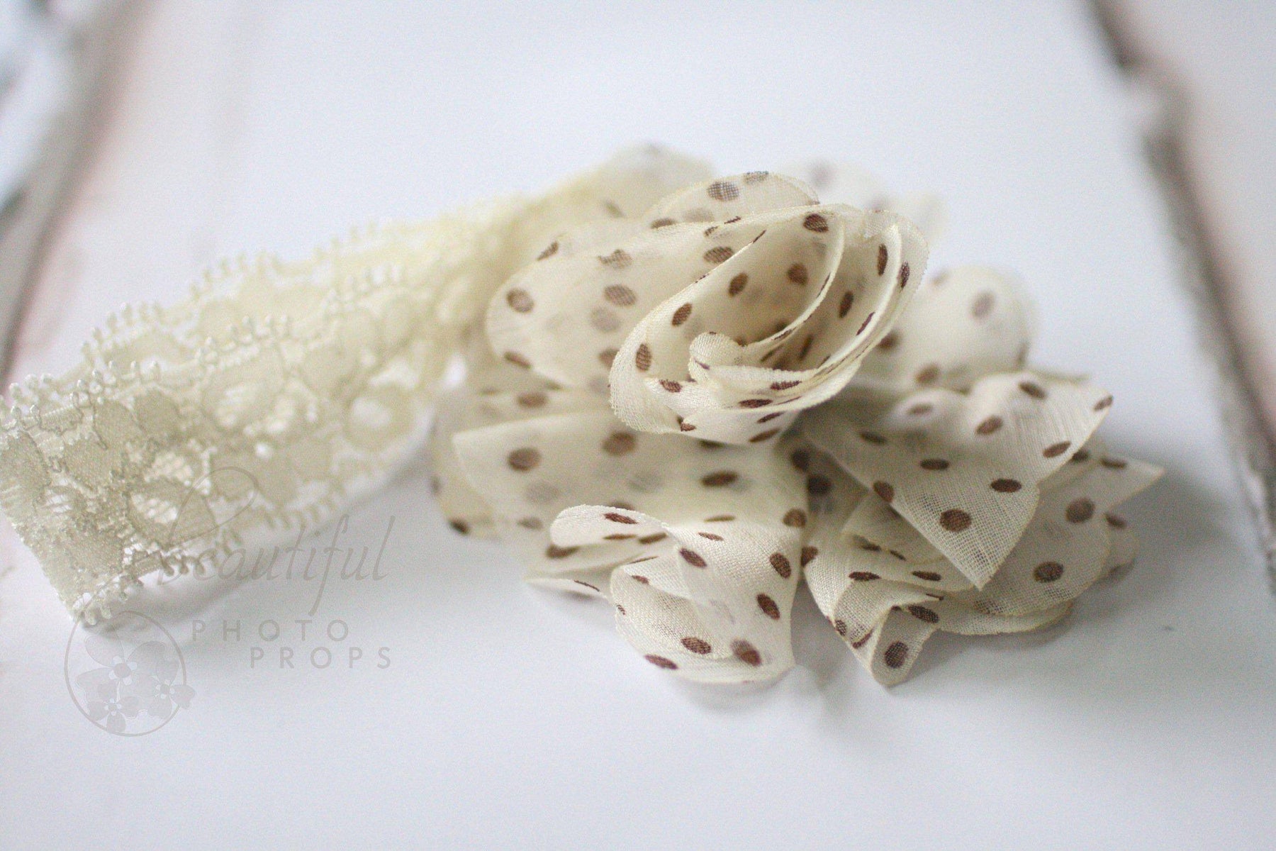 A photographer's dream! This sweet polka dot flower headband is so adorable and soft, it reminds me of being a kid again! The lace elastic band paired with layers of cream petals with cream polka dots is the perfect piece to wear at any age, from newborn to adult!