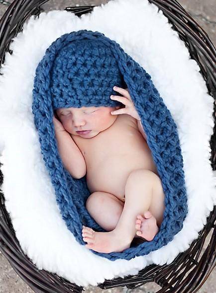 Super thick and oh so chunky! This gorgeous denim blue newborn photography egg cocoon bowl prop and hat set is made from a super cozy acrylic wool blend yarn. The extra large stitches allow for your little babies toes and fingers to show through for the cutest pictures. It is crocheted in the round so that there are no seams. The beanie is also crocheted in the round and measures 13 inches with plenty of stretch.