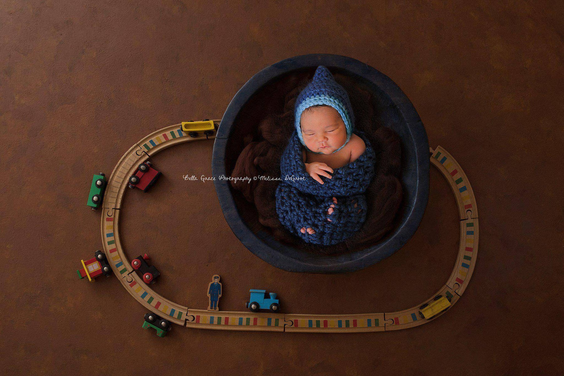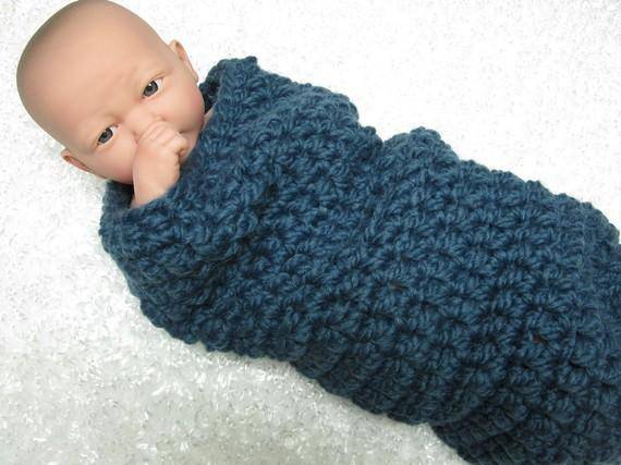 This gorgeous denim blue newborn photography cocoon prop is made from a super thick, super chunky acrylic wool blend yarn. I have crocheted it in a looser stitch so that babies little bits and pieces can poke through.