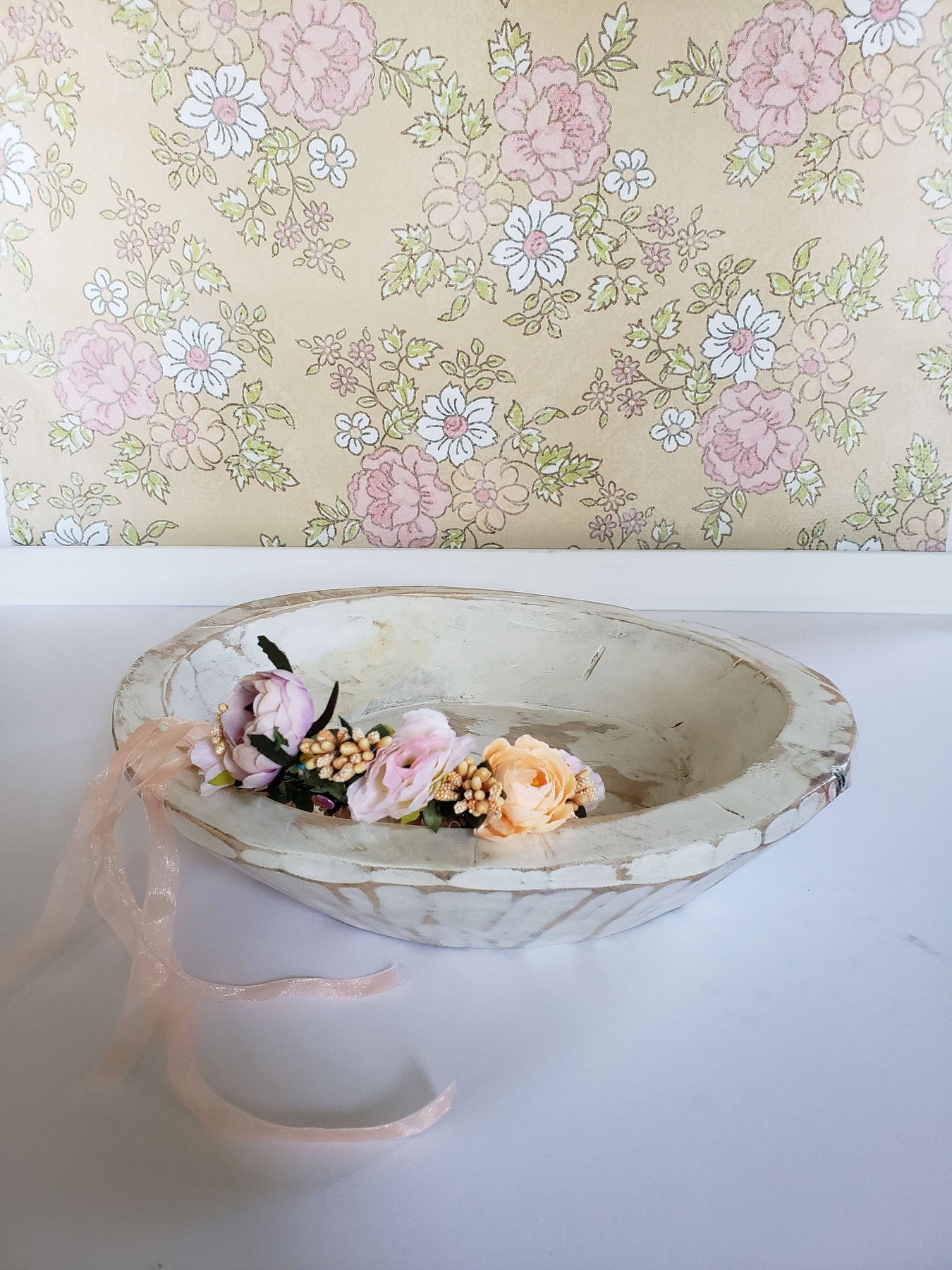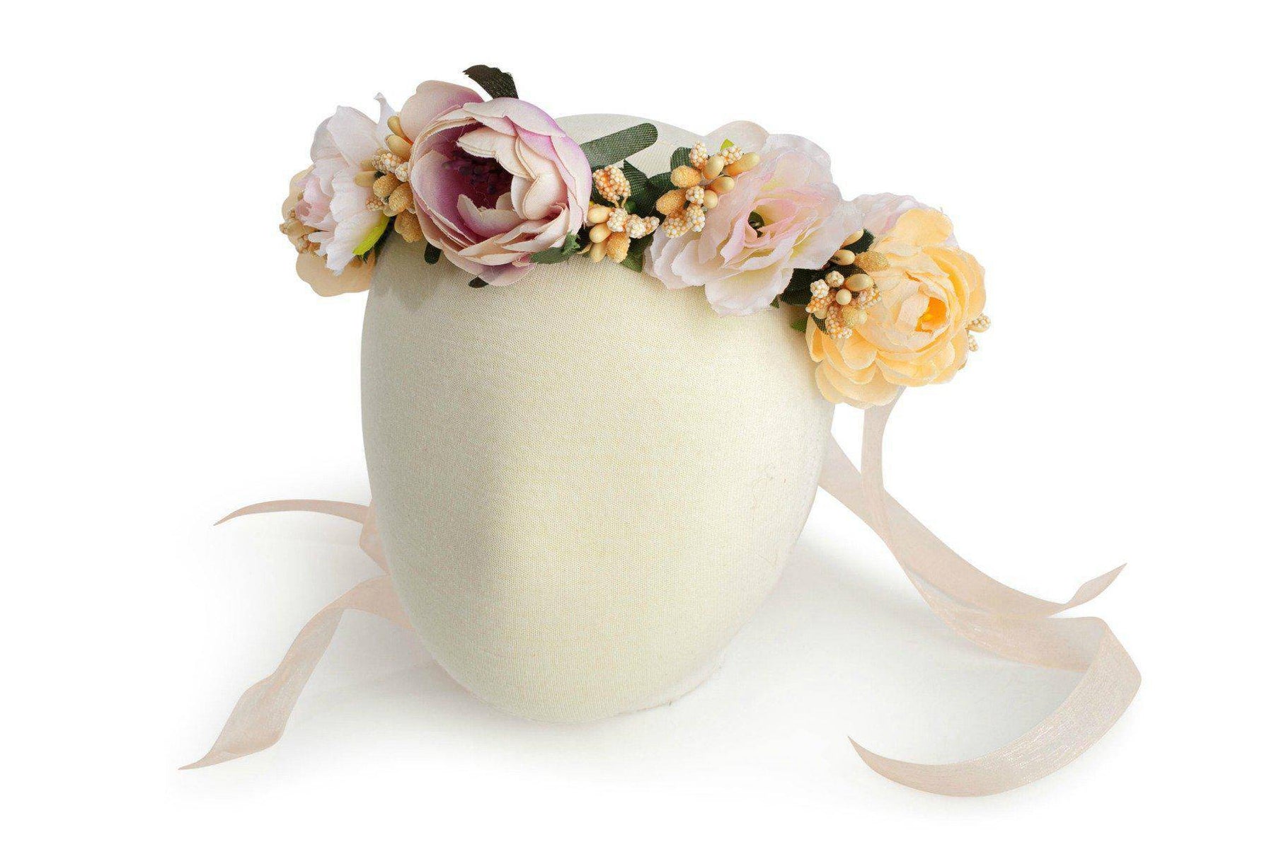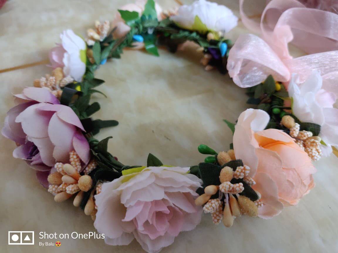 Beautiful pink, peach and yellow adjustable flower crown with lace ties. Fits newborn to adult.