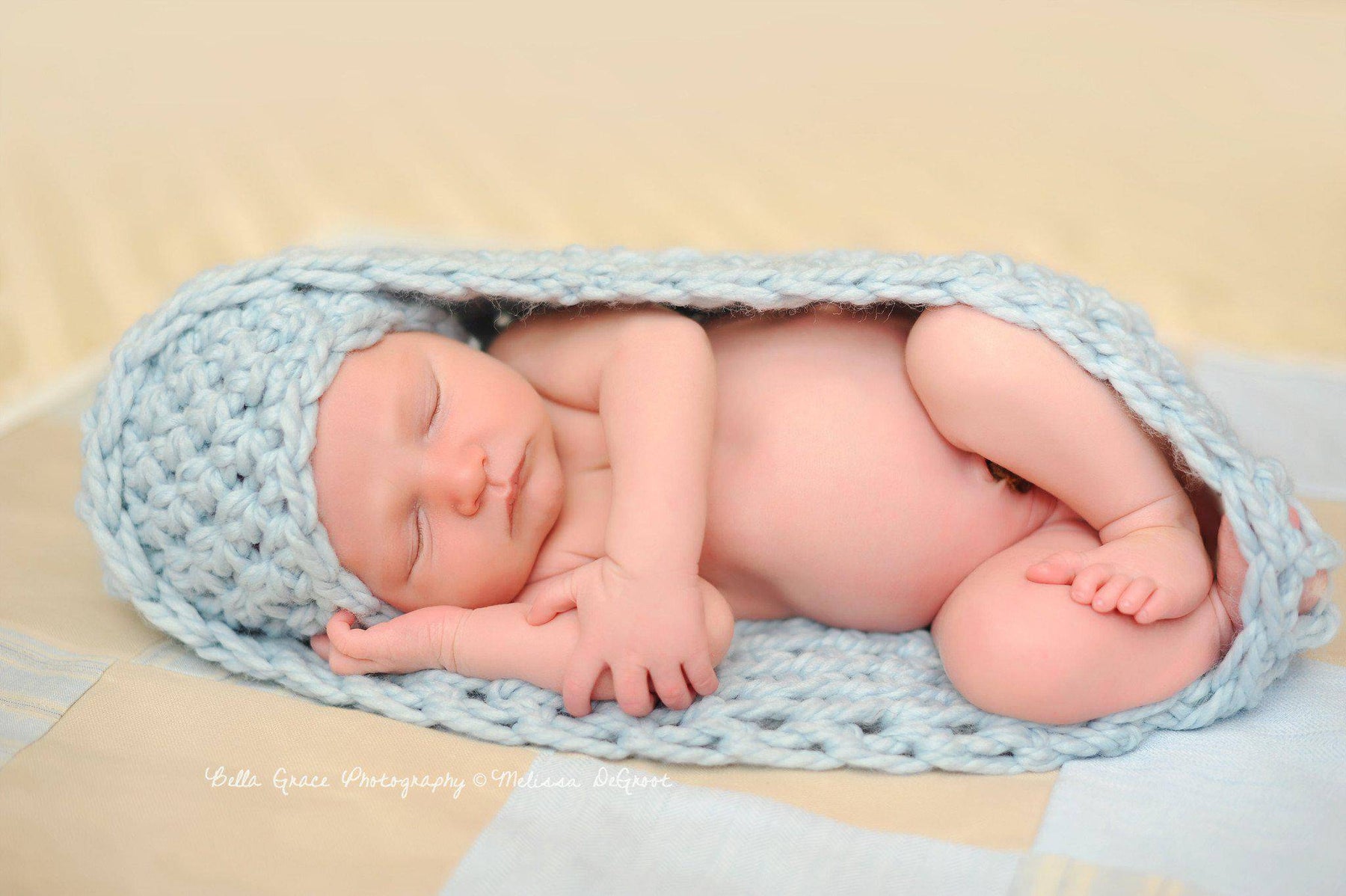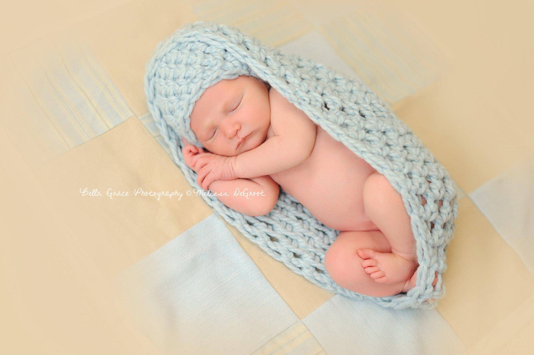 Super thick and oh so chunky! This gorgeous glacier blue newborn photography egg cocoon bowl prop and hat set is made from a super cozy acrylic wool blend yarn. The extra large stitches allow for your little babies toes and fingers to show through for the cutest pictures. It is crocheted in the round so that there are no seams. The beanie is also crocheted in the round and measures 13 inches with plenty of stretch.