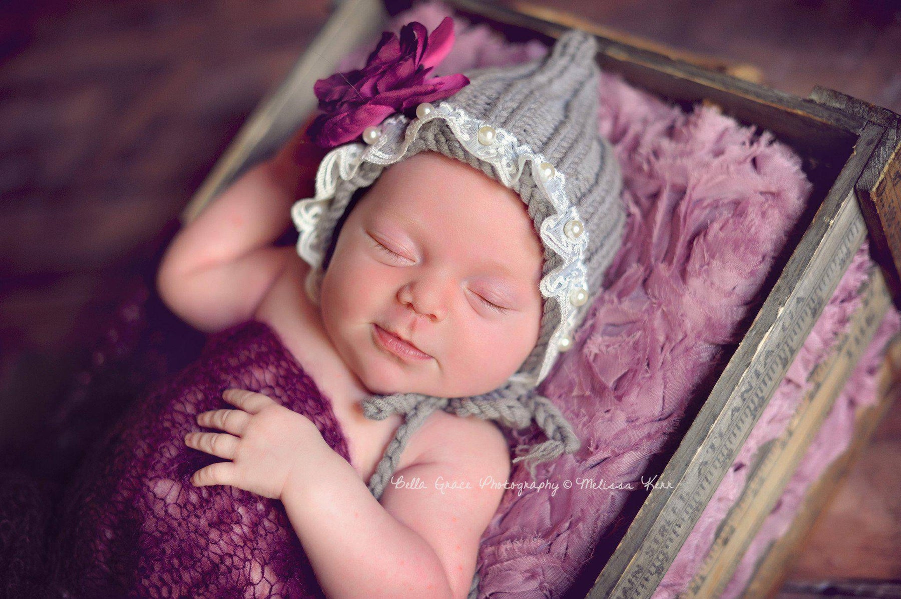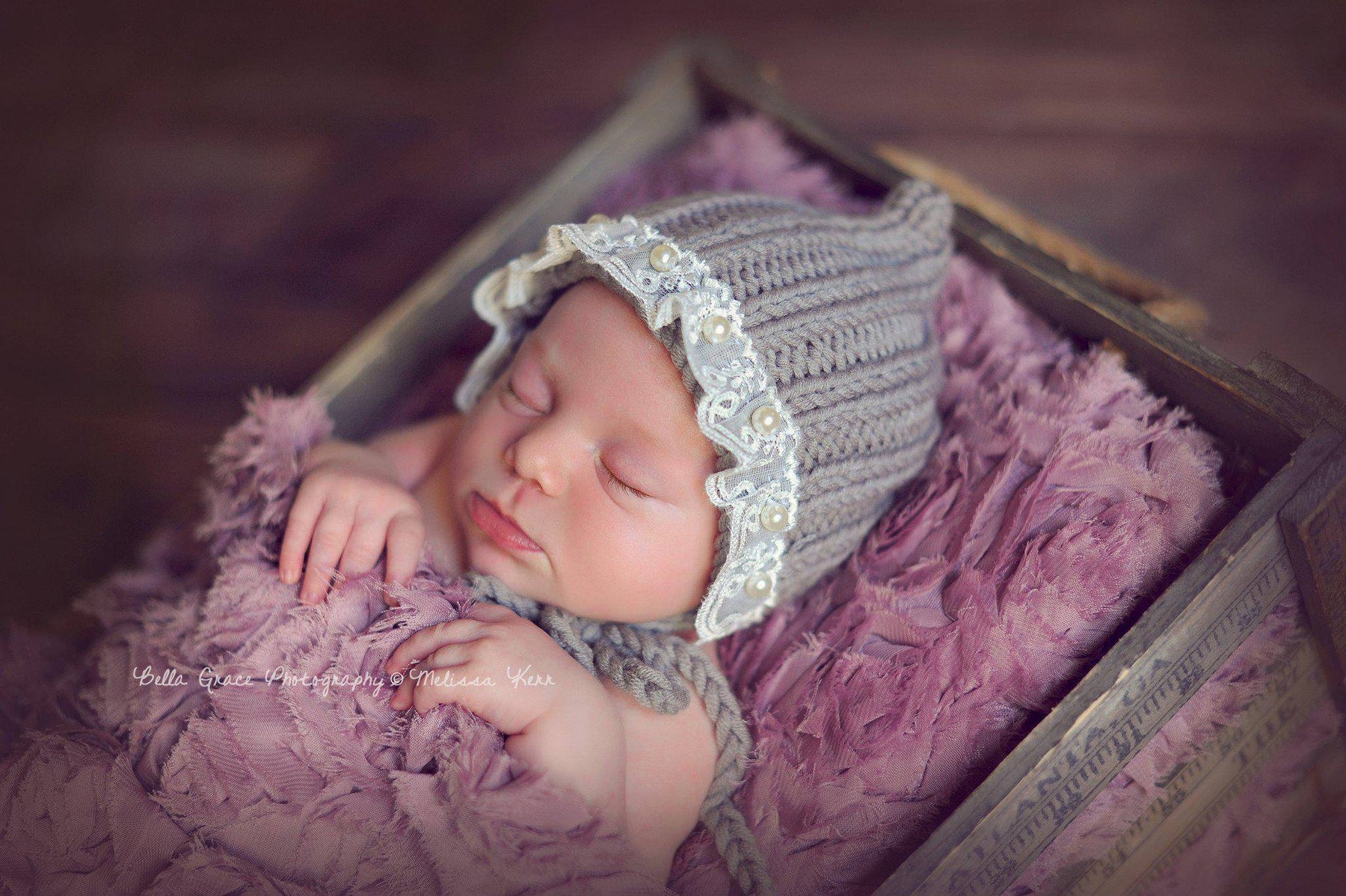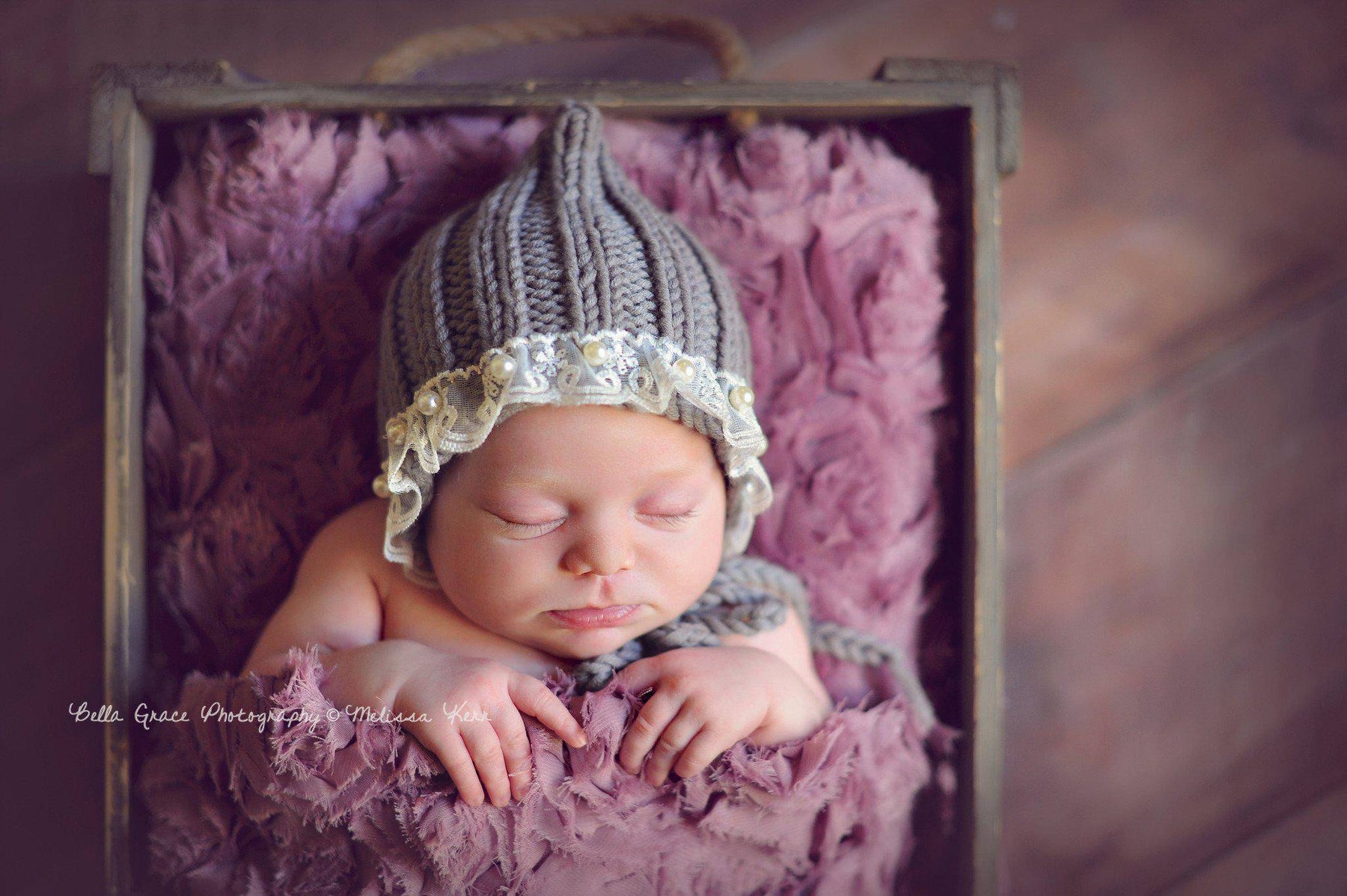 Part of our Natural Newborns organic line! This adorable knit cotton bonnet hat in gray with lace and pearl trip is the perfect hat for your little newborn photos! It is made from a soft organic cotton yarn and is the perfect size for your sweet little newborn :) (Flower was added by the photographer and is not included).