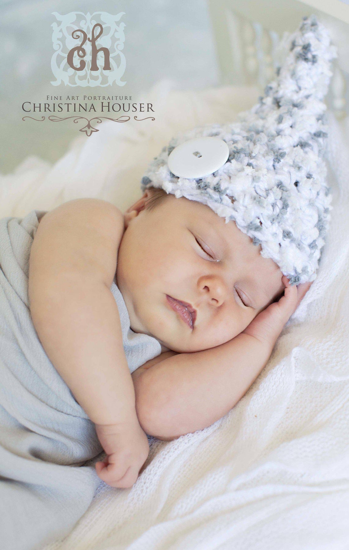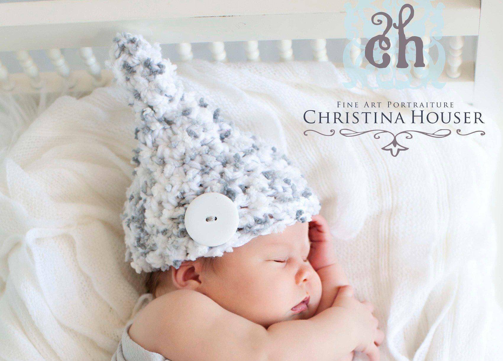 This adorable little gnome hat in shades of gray and white with a white button is the perfect hat for your newborn photos!