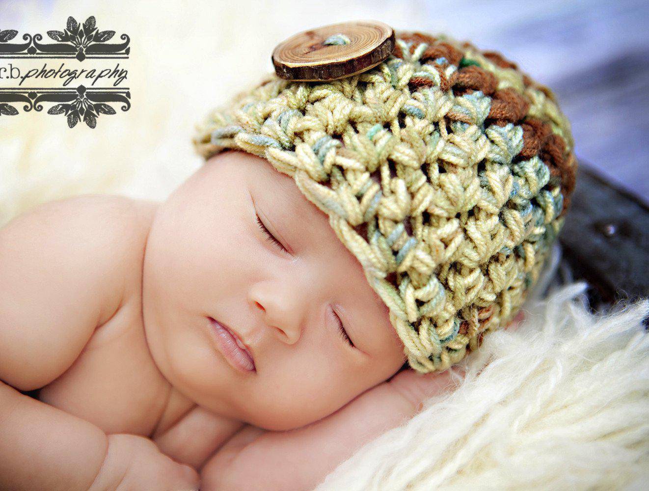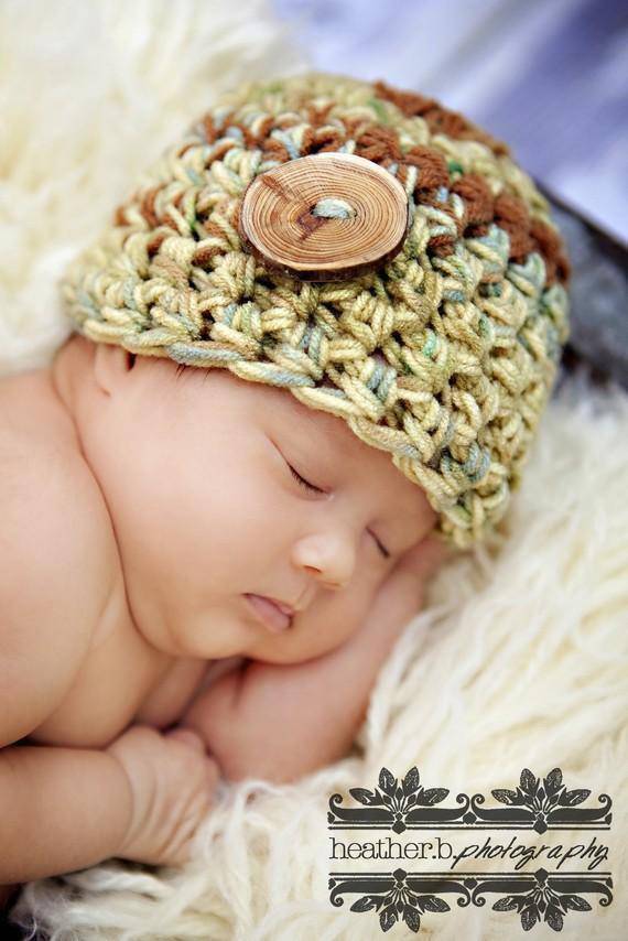 This gorgeous newborn baby beanie hat in shades of greens and browns is made from a super soft acrylic yarn with an oak button embellishment. It is the perfect fit to keep your little ones' noggin' nice and warm.