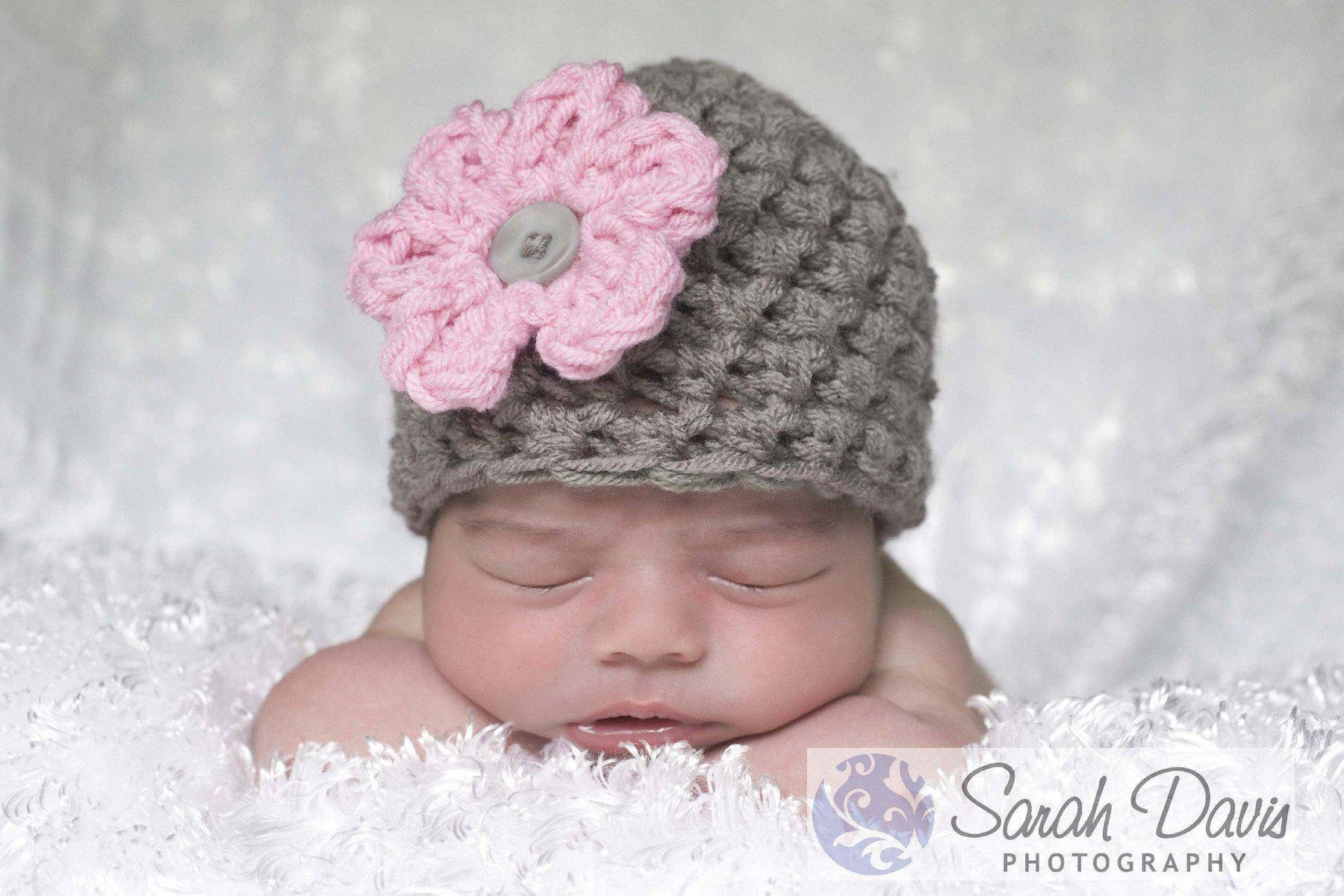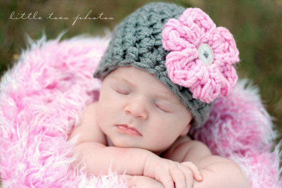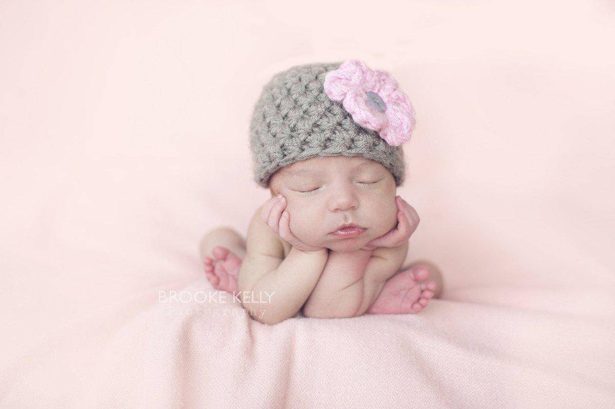 This gorgeous grey newborn photography beanie hat prop with soft pink flower is made from a super soft acrylic yarn. It is the perfect fit to keep your little ones' noggin' nice and warm.