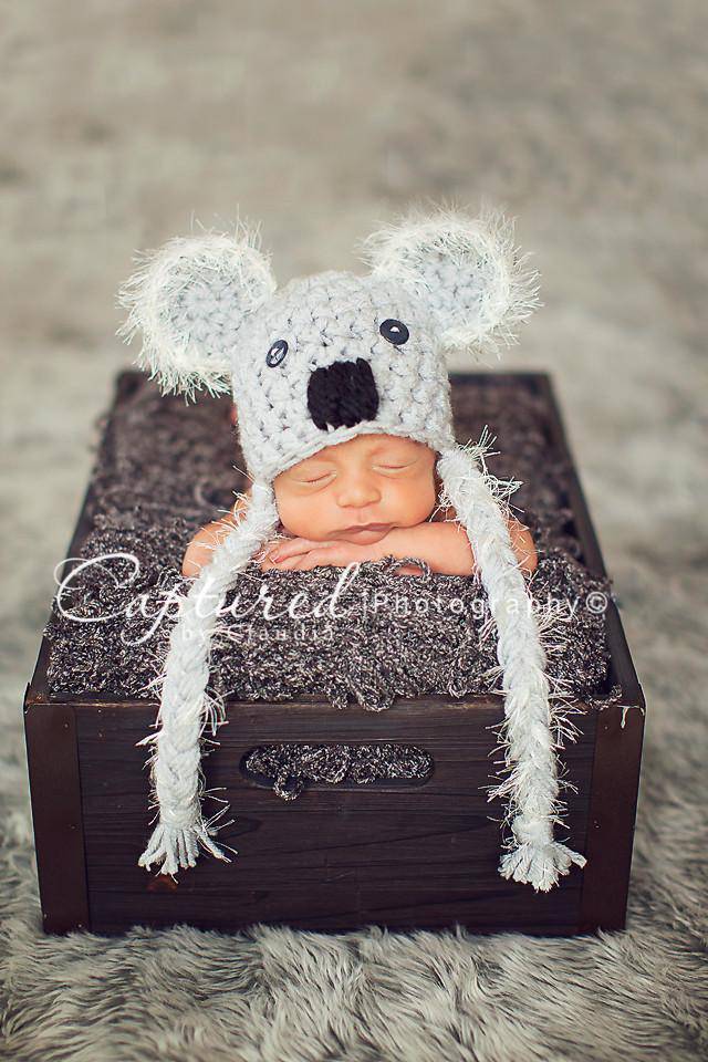 This cute little light gray koala bear hat with fuzzy ears and ties is the perfect hat for those newborn photos!