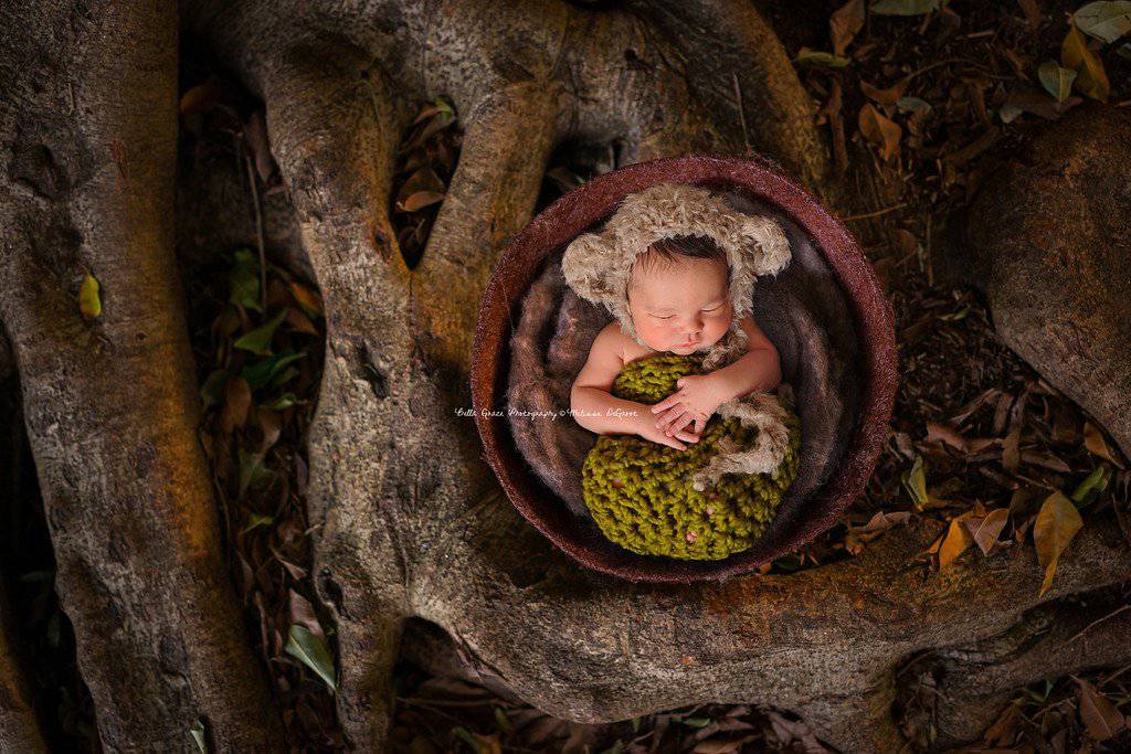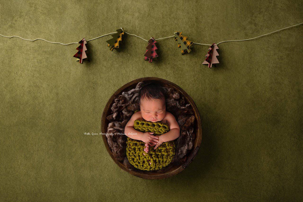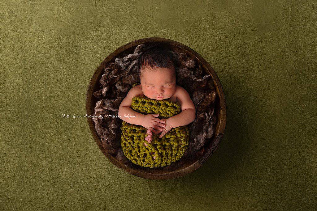 This gorgeous lemongrass green newborn photography cocoon is made from a thick, super chunky acrylic wool blend yarn. I have crocheted them in a looser stitch so that babies little bits and pieces can poke through.