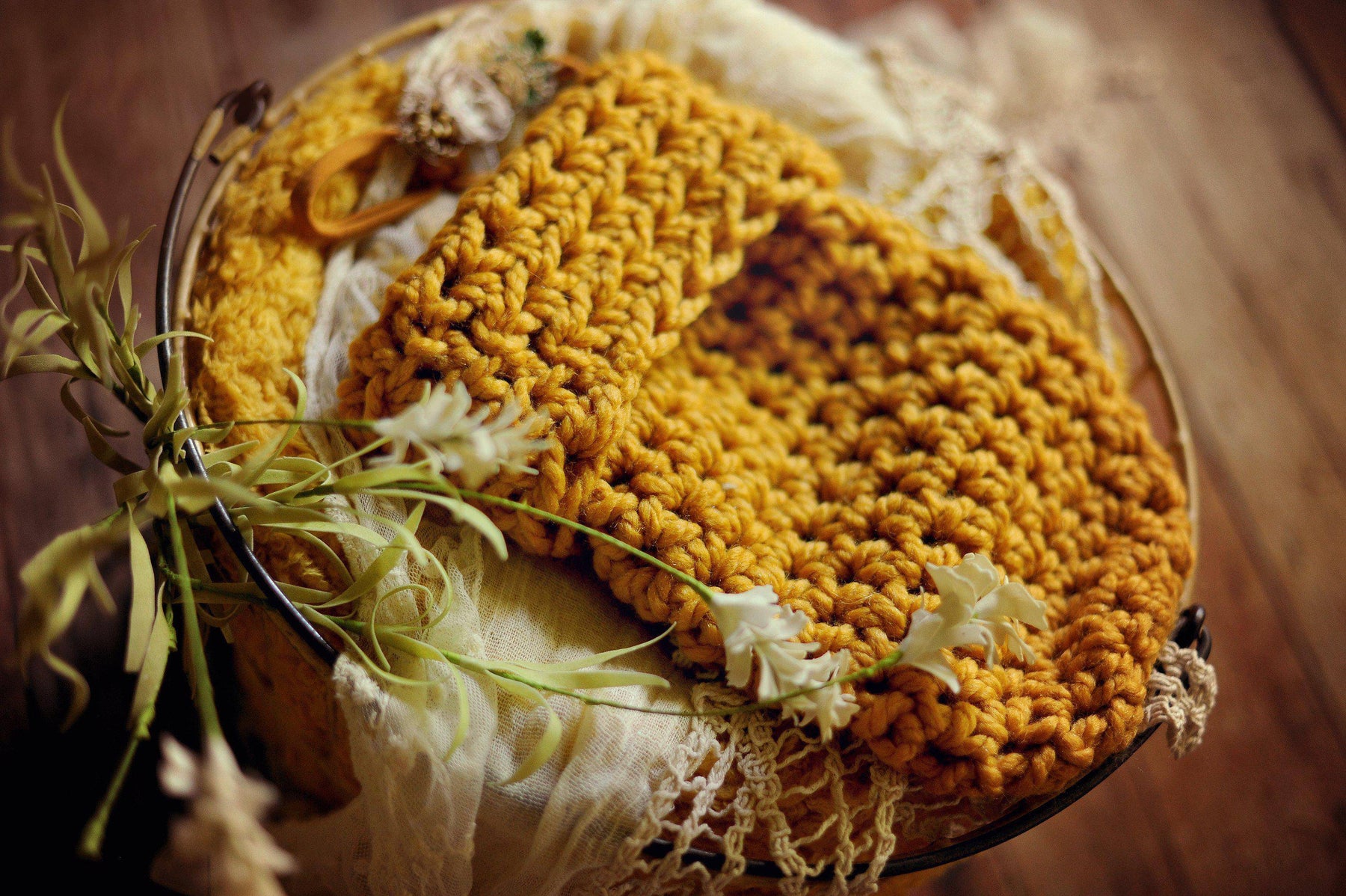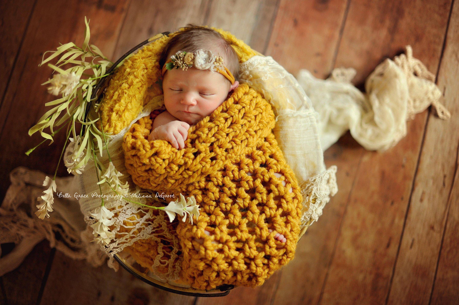 This gorgeous mustard yellow newborn photography cocoon prop is made from a super chunky acrylic wool blend yarn. I have crocheted it in a looser stitch so that babies little fingers and toes can poke through.