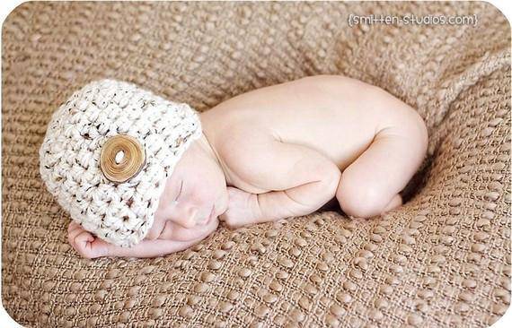 This gorgeous oatmeal beige newborn photography beanie hat prop is made from a super soft acrylic yarn with a real wood branch button embellishment. It is the perfect fit to keep your little ones' noggin' nice and warm.