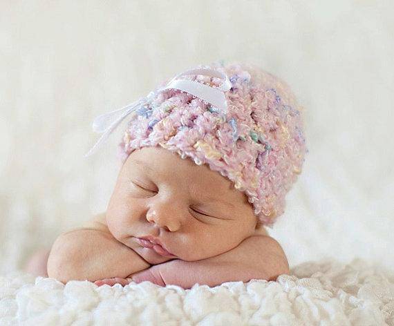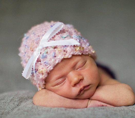 This gorgeous soft pink confetti newborn photography beanie hat prop is made from a super soft acrylic yarn with a ribbon embellishment. It is the perfect fit to keep your little ones' noggin' nice and warm.