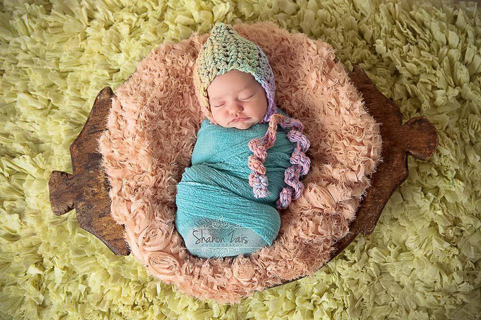 This adorable bonnet hat in shades of pink, purple, blue and green with curly ties is the perfect hat for those newborn photos!
