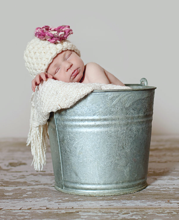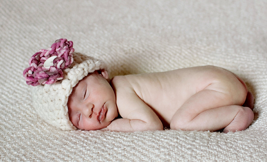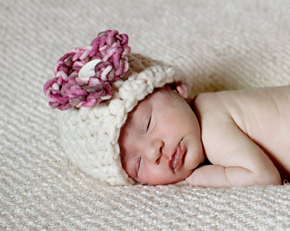 This gorgeous newborn photography beanie hat prop is made from a super soft wool blend yarn with a trim and flower embellishment and totally reminds me of a cherry blossom tree with it's sweet shades of pinks, creams and browns. It is the perfect fit to keep your little ones' noggin' nice and warm.