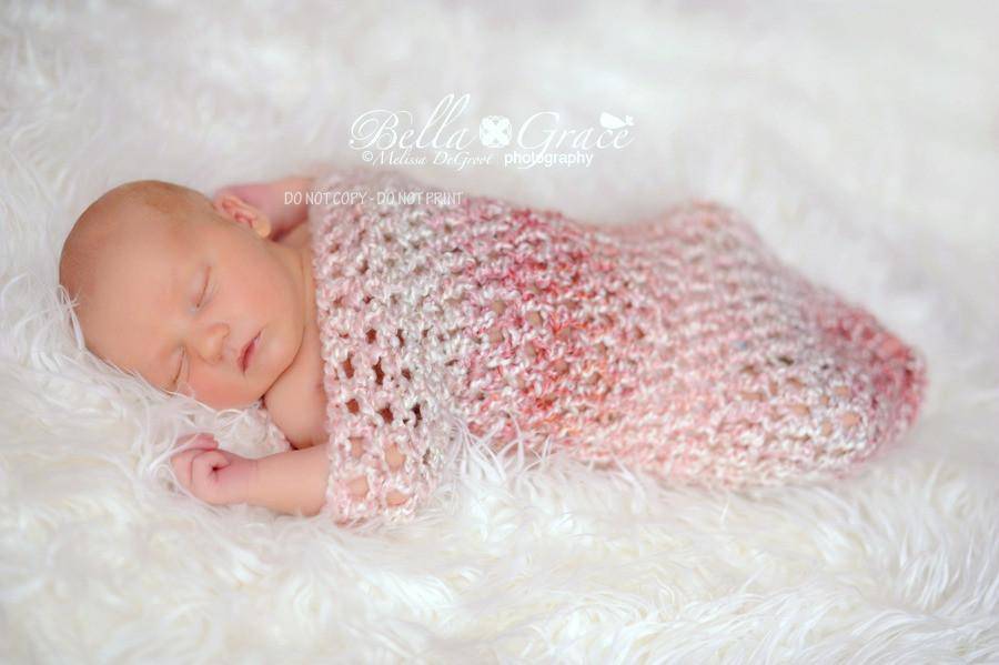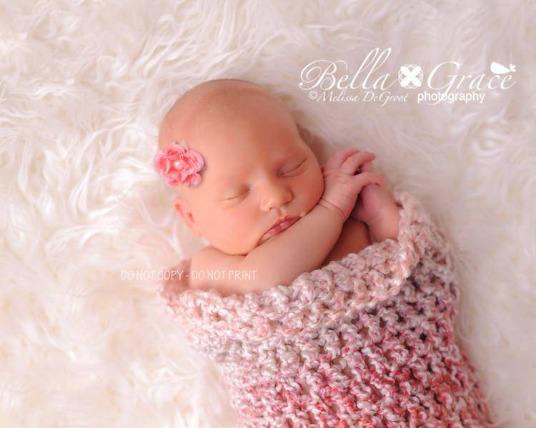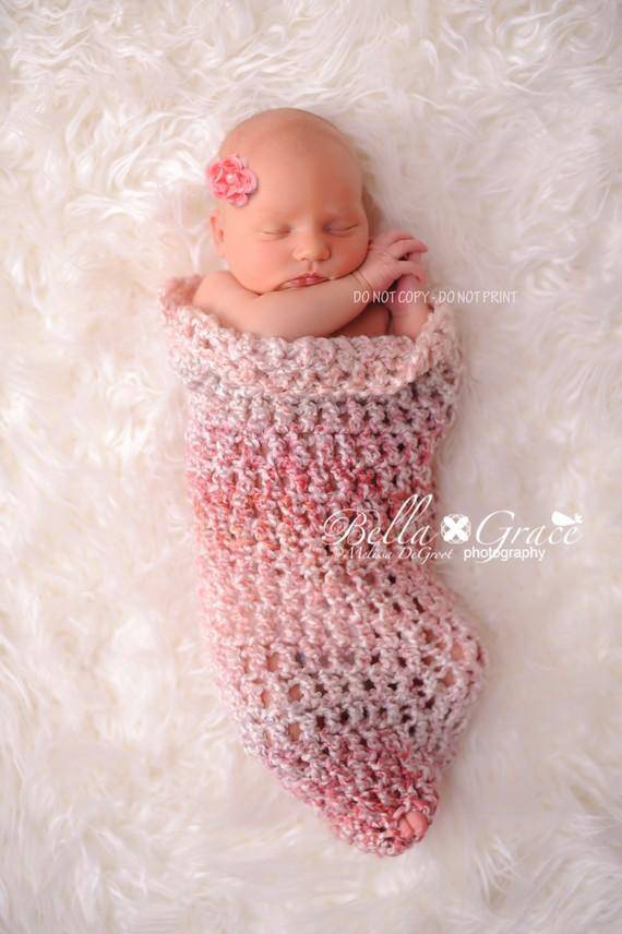 This gorgeous newborn photography cocoon prop in shades of cream and pink is made from a super soft acrylic boucle yarn. I have crocheted it in a looser stitch so that babies little bits and pieces can poke through.