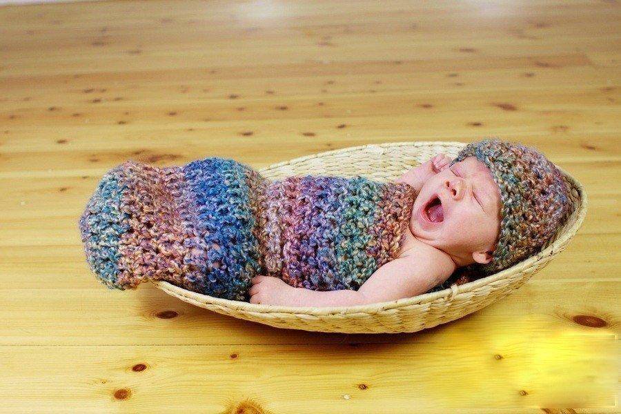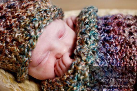 This gorgeous newborn photography cocoon and beanie hat prop set in shades of blue, purple, pink, beige, rust and aqua is made from a super soft acrylic boucle yarn and reminds me so much of a palette of watercolors. I have crocheted the cocoon in a looser stitch so that babies little bits and pieces can poke through and the hat is the perfect fit to keep your little ones' noggin' nice and warm. Please note that because this is a multi-colored yarn, the striping effect may not always end up like this.