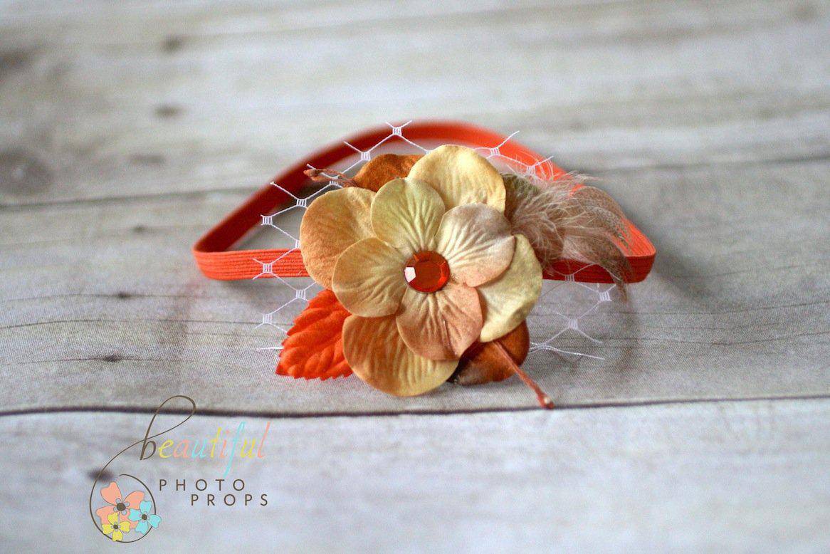 This sweet vintage inspired orange flower feather headband with Russian veiling is so adorable! The matching elastic band paired with layers of petals and a rhinestone center is the perfect piece to wear at any age, from newborn to adult!
