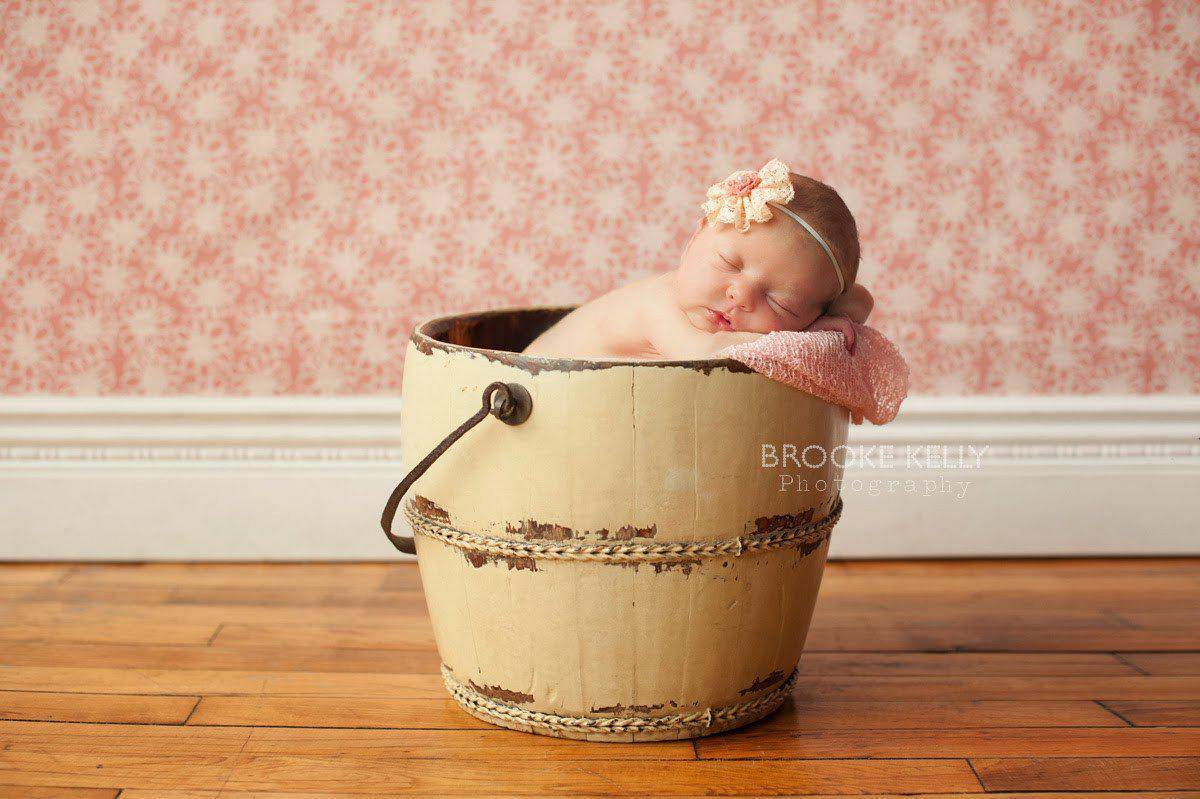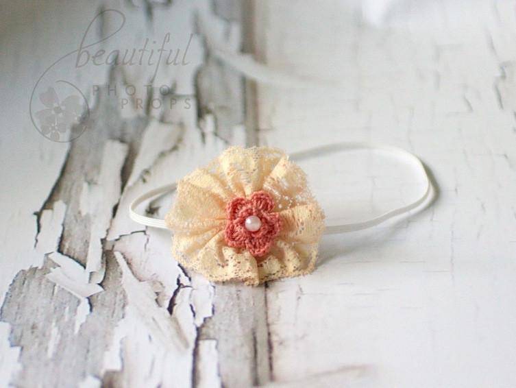 Beautiful peach and coral lace flower with faux pearl center on a skinny elastic band. The perfect piece for newborns to adults!
