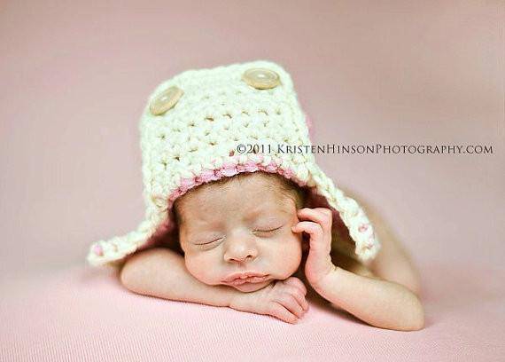 This adorable newborn AVIATOR hat is THE perfect photo prop! It is made from two different acrylic yarns in shades of pink and cream with coordinating buttons and is the perfect size for your sweet little newborn to keep her head nice and warm :)
