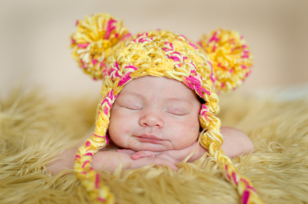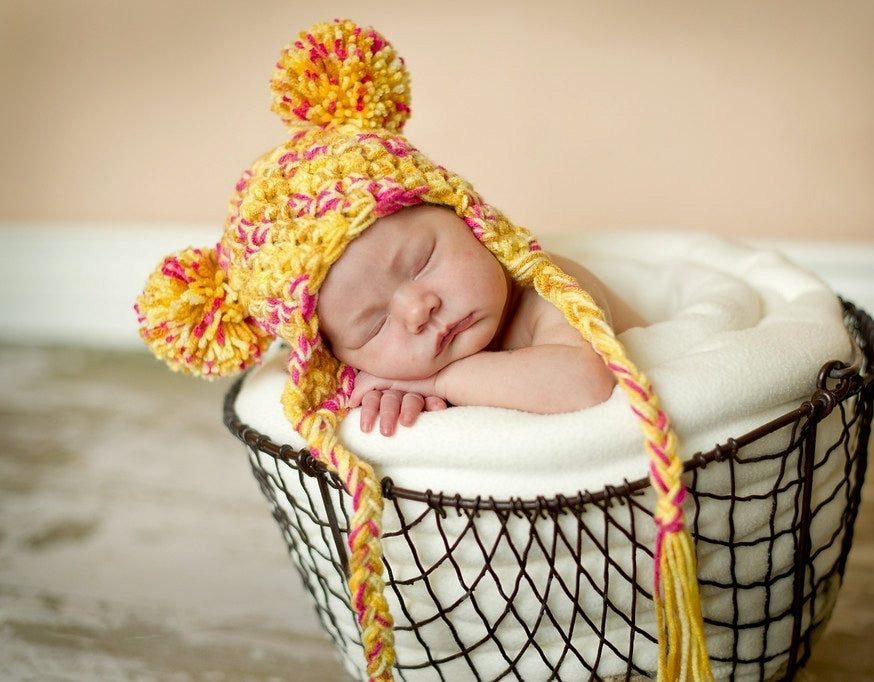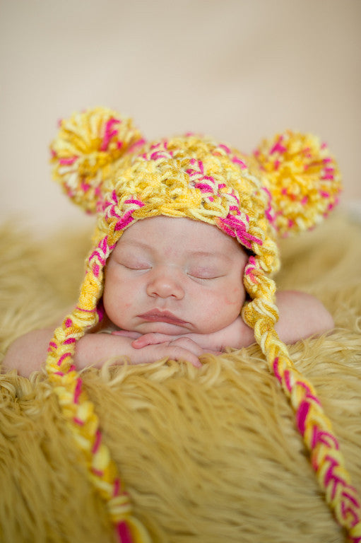 This cute little crocheted hot pink and yellow earflap hat with big pom poms is the perfect hat for those newborn photos!