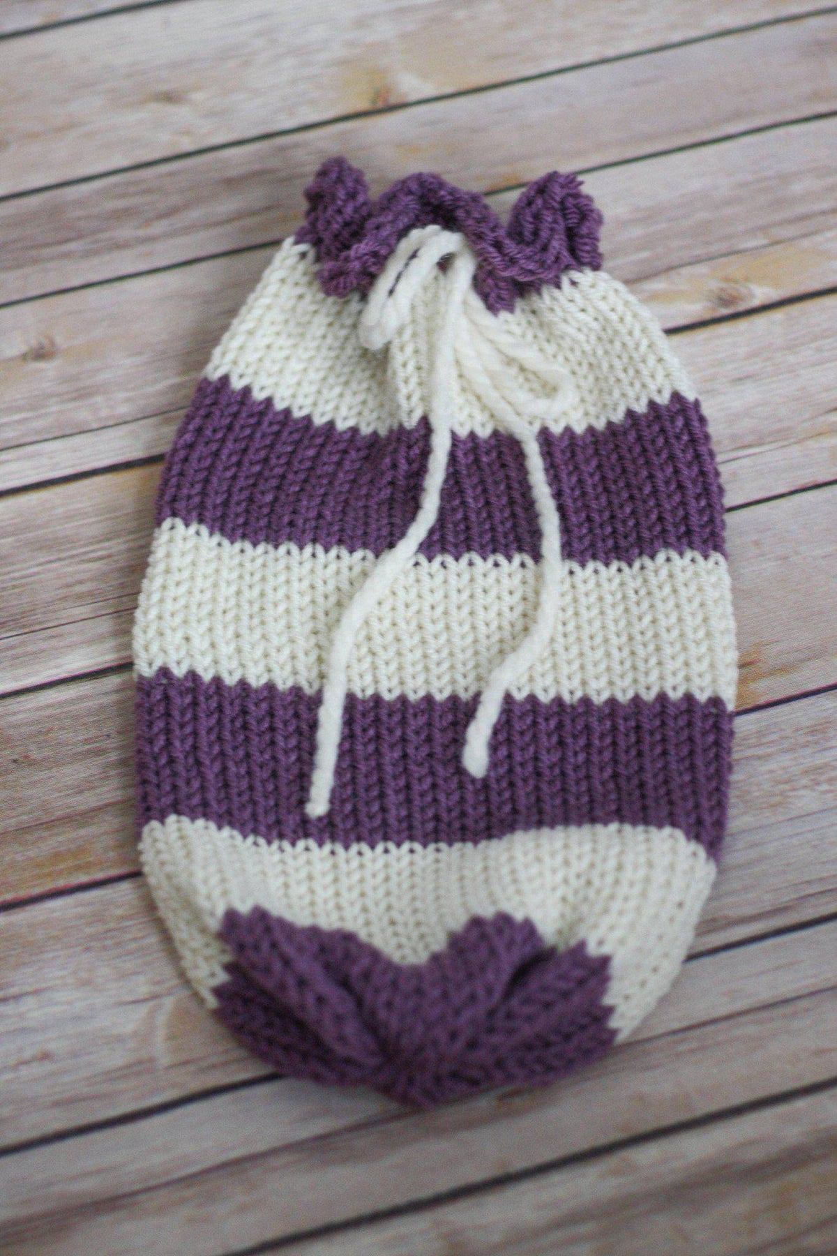 This gorgeous purple and cream striped newborn swaddle sack photography cocoon prop is made a nice soft acrylic blend yarn. Your sweet little one will feel so warm and comfy wrapped in this super soft swaddle sack!