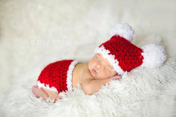 This gorgeous red and white newborn diaper cover and pom pom sack hat set is made from a super soft acrylic yarn trimmed in fluffy snow white. The hat has soft pom poms on top and the diaper cover unbuttons for easy use.