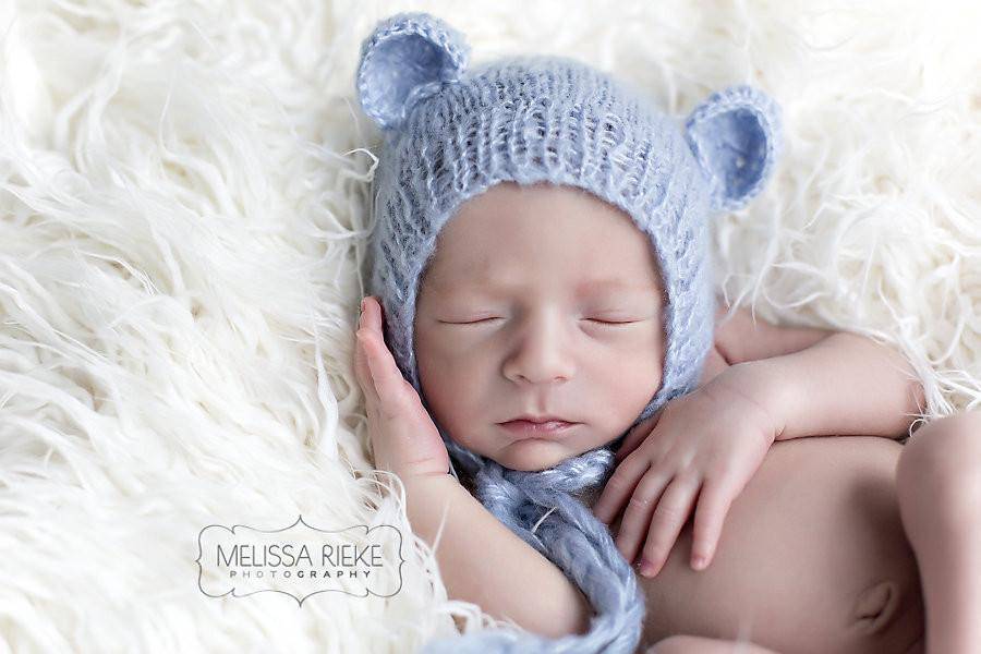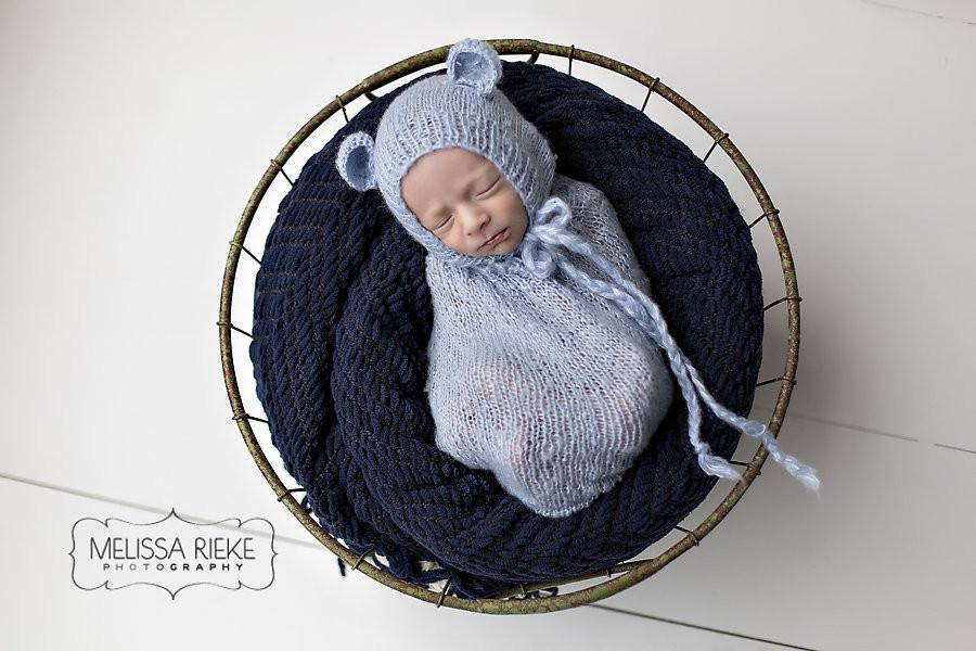 SET Blue Teddy Bear Hat and Knit Swaddle Cocoon Sack