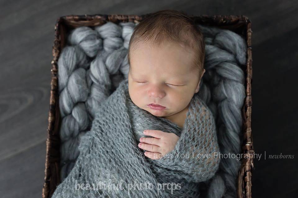 About the mohair wrap: These loosely knit, extremely stretchy and versatile mohair wraps are easy to use and can be completely swaddled around newborn babies for the perfect first photo! They measure approximately 16" x 31" unstretched.