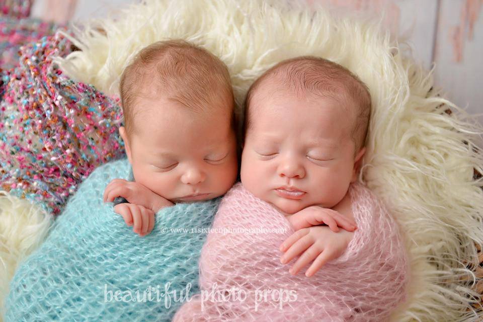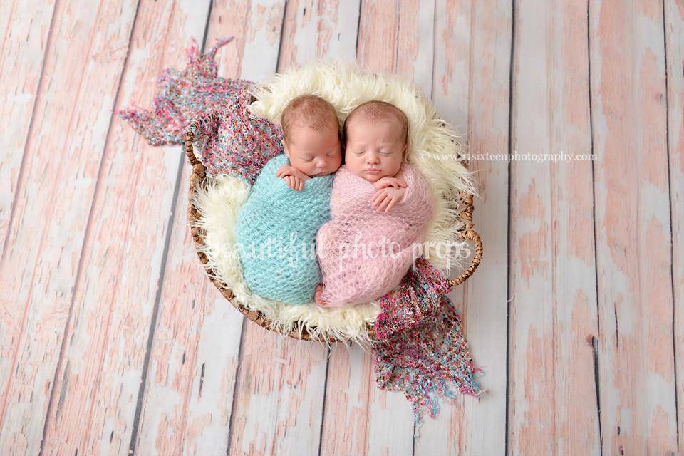 Set of two mohair wraps! These loosely knit, extremely stretchy and versatile mohair wraps are easy to use and can be completely swaddled around newborn babies for the perfect first photo! They measure approximately 16" x 31" unstretched.