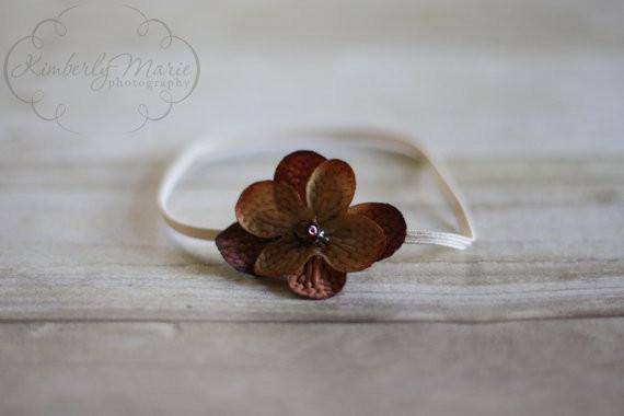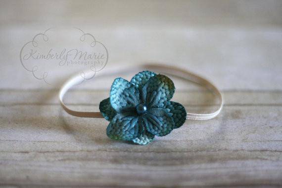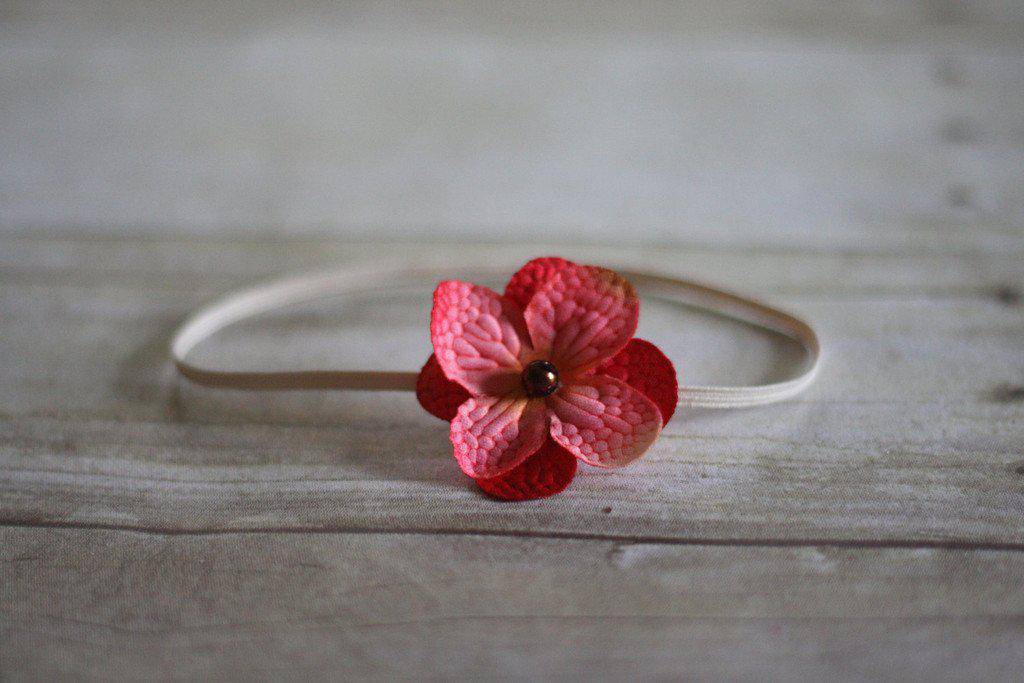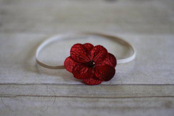 Set of six beautiful flower headbands with bead centers on skinny white elastic bands. Comes in blue, green, red, brown, purple and pink/red.