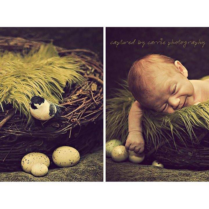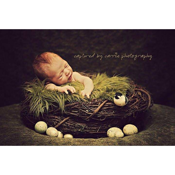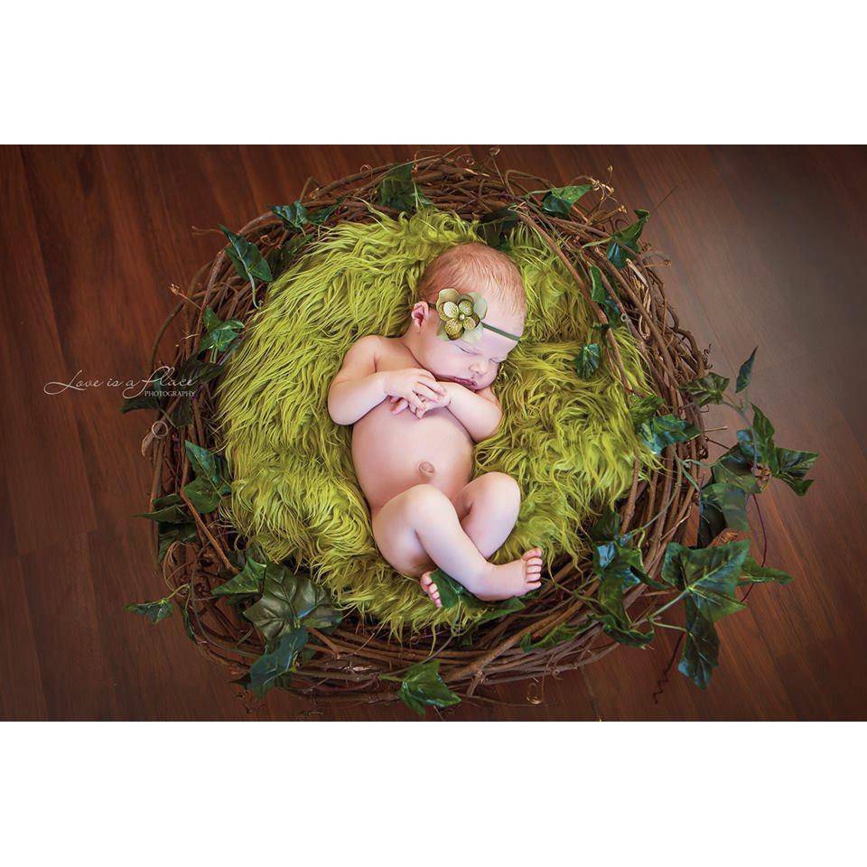 This is THE perfect prop set for your newborn photos! Imagine your sweet little one all curled up like a little bird or owl on a soft fur inside this nest! This sweet nest measures approximately 20 inches around and 8 inches tall (size varies slightly from nest to nest). And to make it even better it's paired with one of my 27x20 Olive mongolian furs (does not include the leafy vine shown in photo).