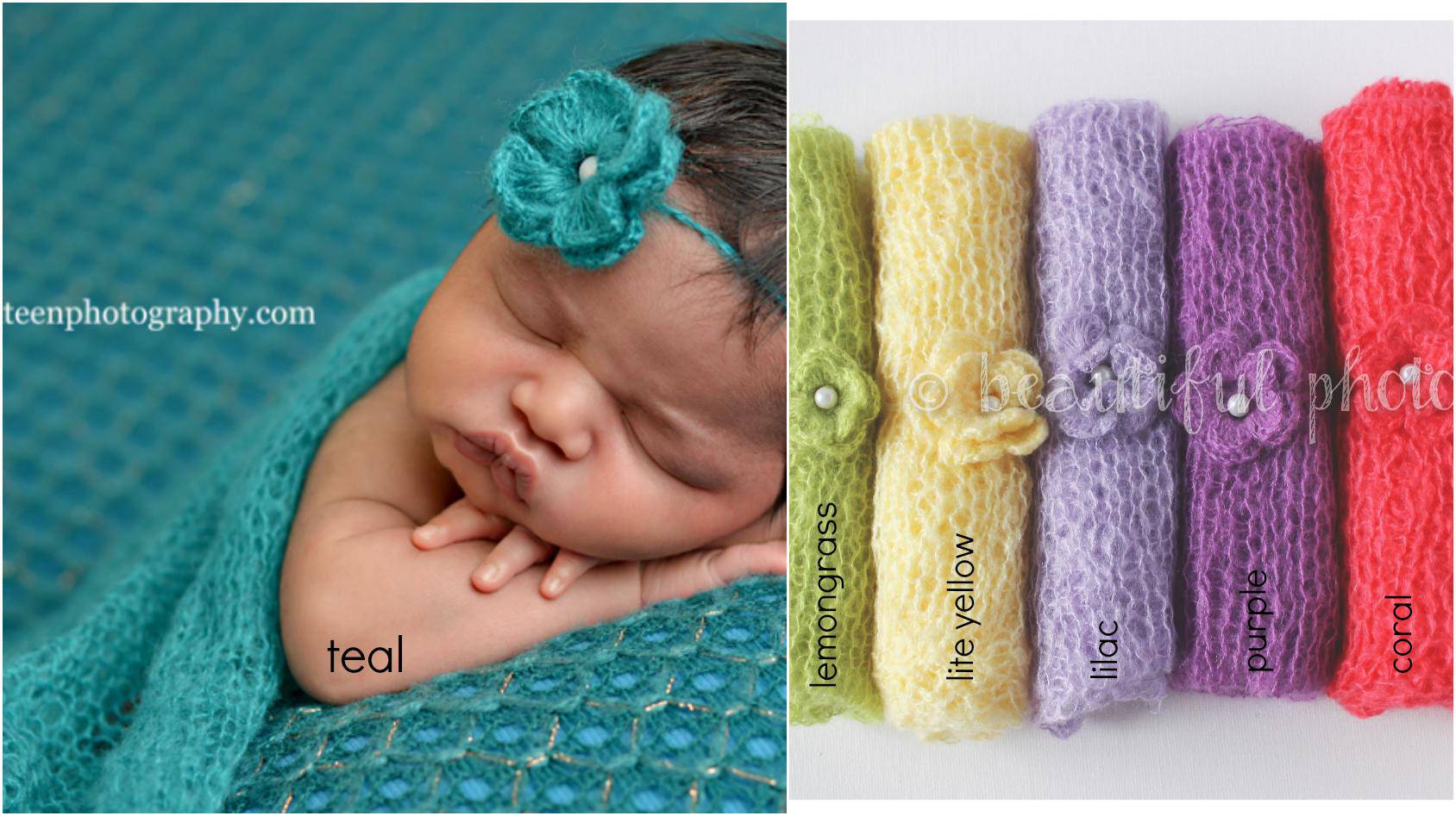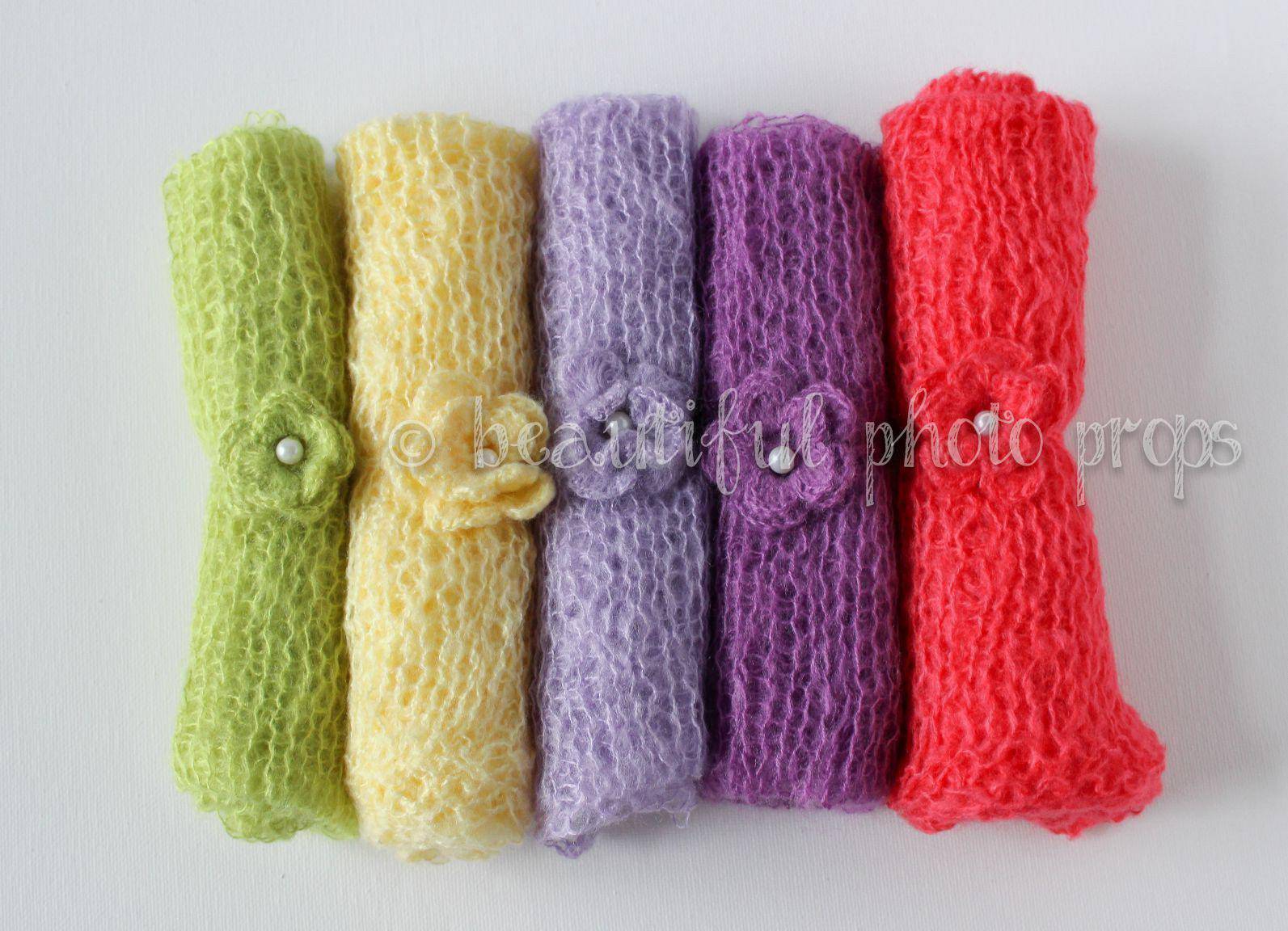 These loosely knit, extremely stretchy and versatile mohair wraps are easy to use and can be completely swaddled around newborn babies for the perfect first photo! They measure approximately 16" x 31" unstretched. Comes with matching mohair flower headband.