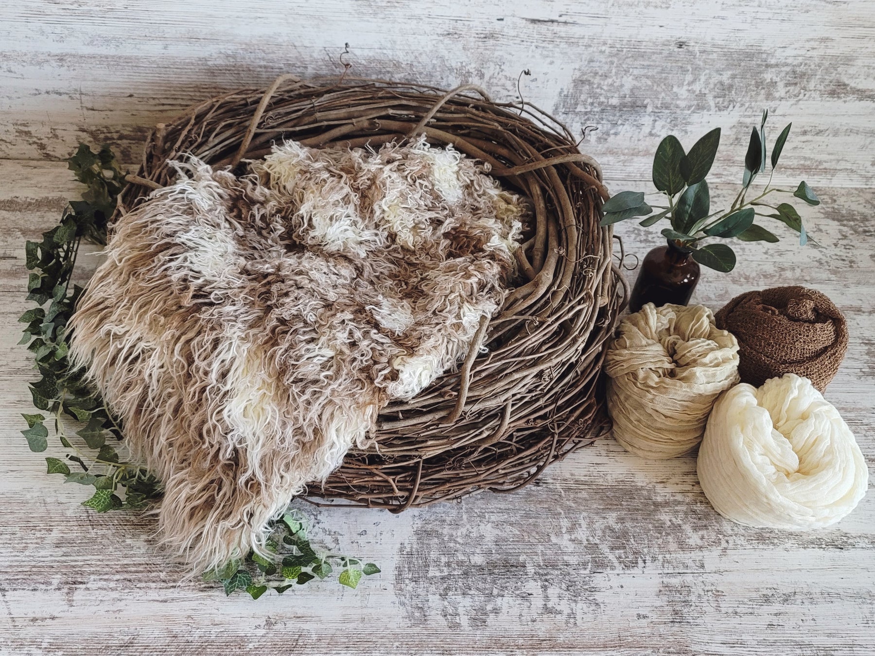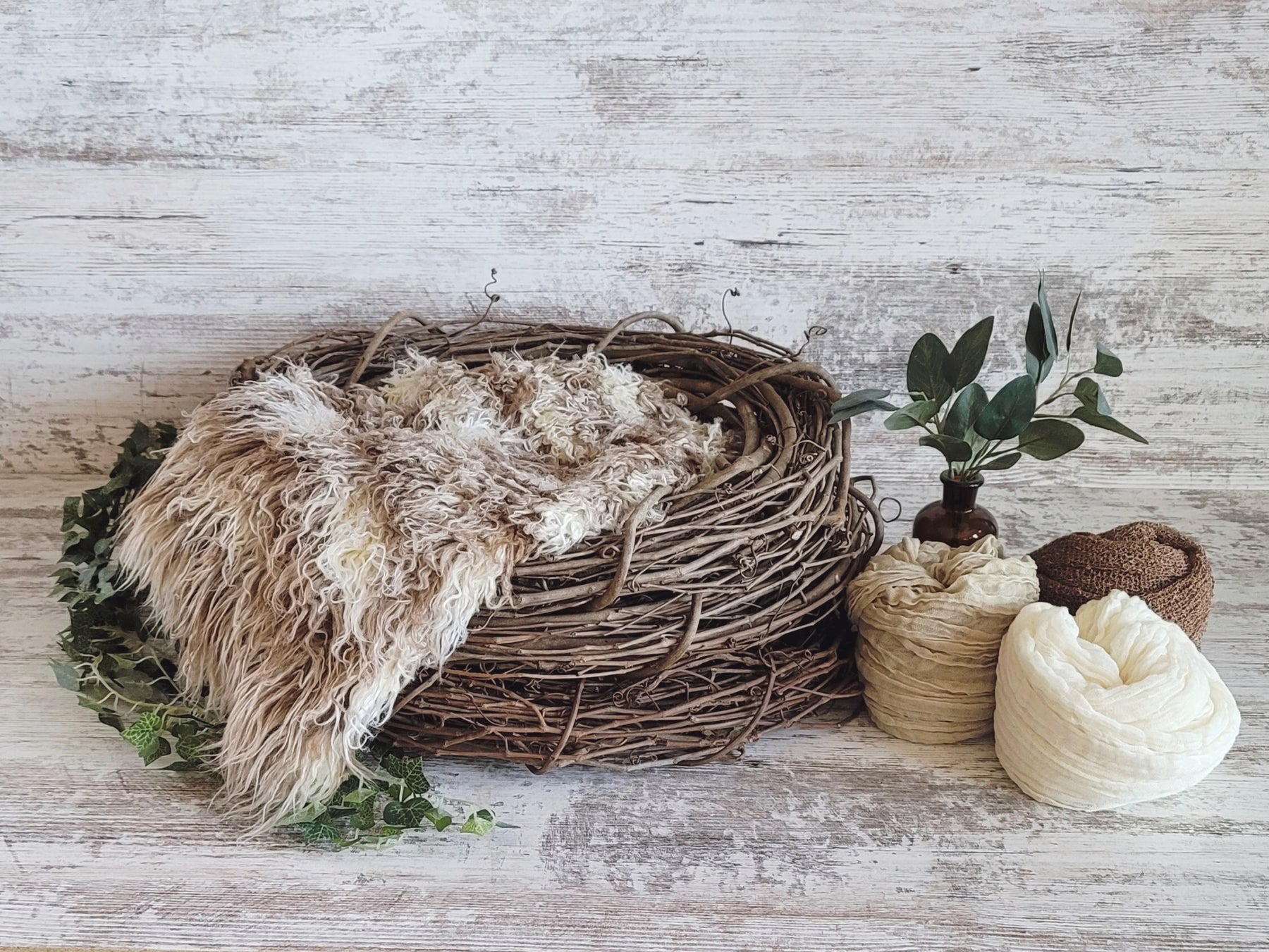 This complete newborn photography studio set includes a wood branch nest, a 27x20 soft African faux flokati fur, a chocolate stretch knit wrap, a wheat cheesecloth wrap and cream cheesecloth wrap. The perfect starter set addition to your studio! (Greenery not included).